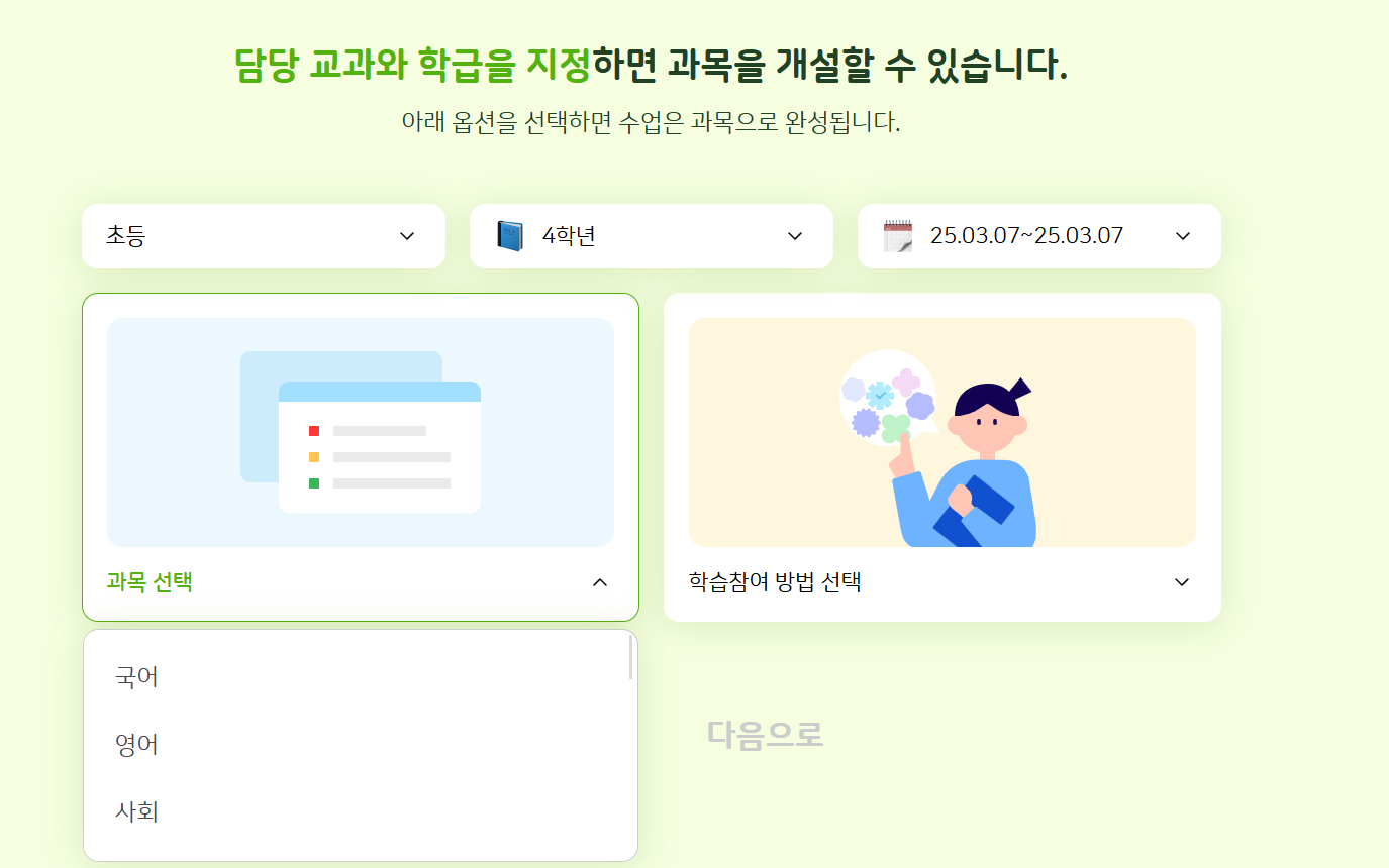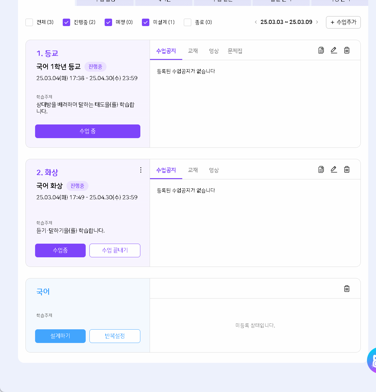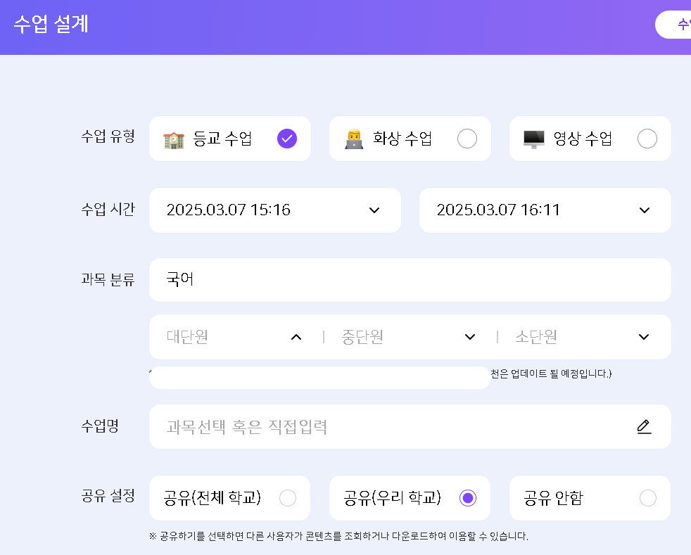 나의 수업 : 국어,수학 과목 분류-대단원 없음. 수업 생성 불가 |