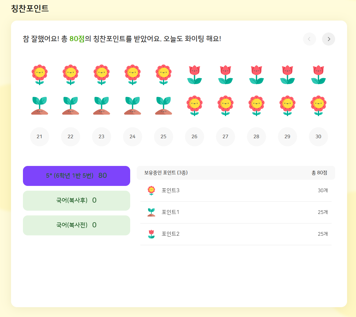 | Steps To Reproduce | 1. 교사 로그인 / 학생 로그인 2. 교사가 특정 학생에게 칭찬 포인트 부여 3. 학생의 캐릭터 및 레벨 변화 확인 | ||||