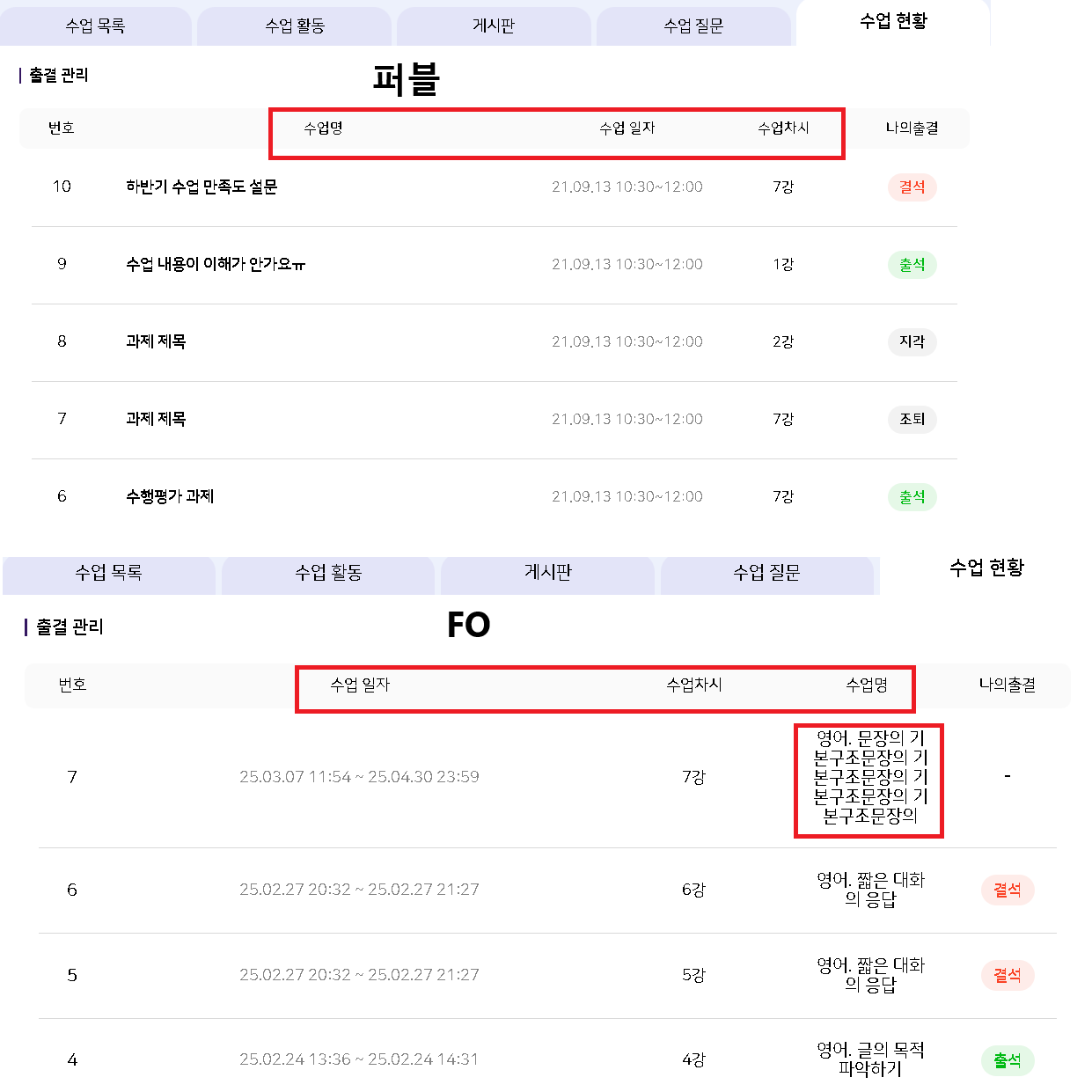 | Description | [학생] 나의 수업-수업 현황 리스트 노출 순서가 퍼블과 달라서 수업명이 좁아지는 현상 발생 퍼블은 번호-수업명-수업일자-수업차시 순으로 노출되는데 FO는 번호-수업일자-수업차시-수업명으로 노출되고 있음 | ||||