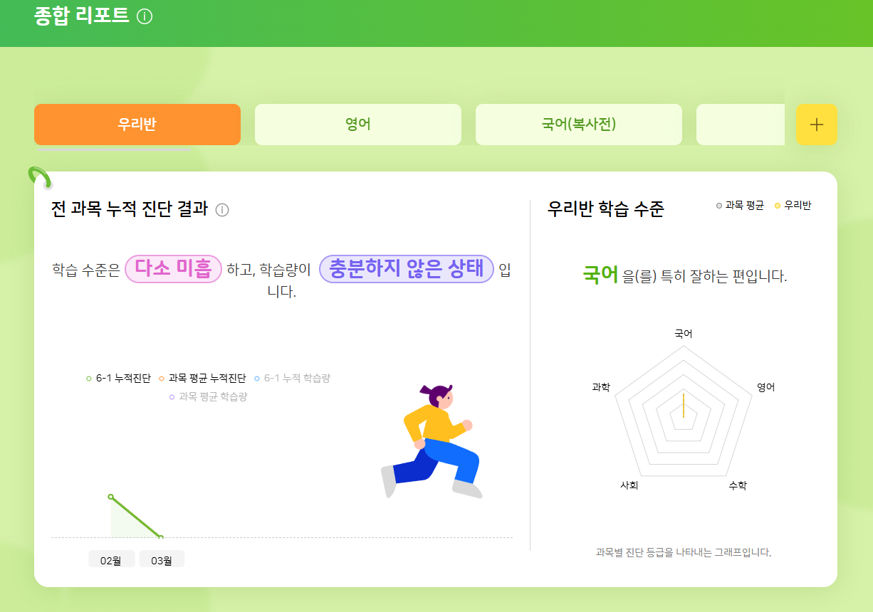 | Description | 종합 리포트 > 전 과목 누적 진단 결과 그래프의 동그라미가 잘리는 현상 | ||||