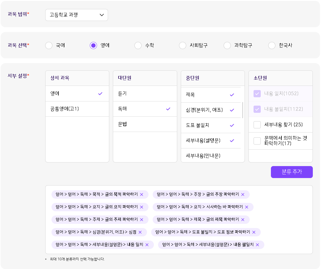 | Steps To Reproduce | 1. 고등 교사 로그인 > 학습 콘텐츠 > 문항 > 선택 출제 2. 아래 첨부한 사진의 세부설정으로 등록 > 다음 클릭 3. 응시 | ||||