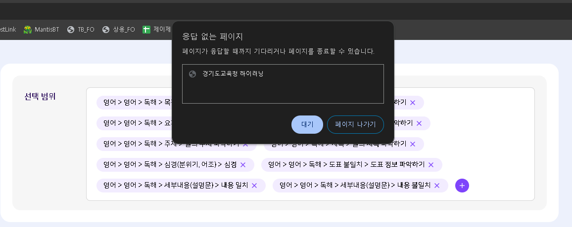 | Description | 학습 콘텐츠 - 선택 문항 출제시 문제가 많은 단원 분류 추가 하면 2단계 페이지에서 무한로딩 및 응답 없는 페이지 발생 | ||||