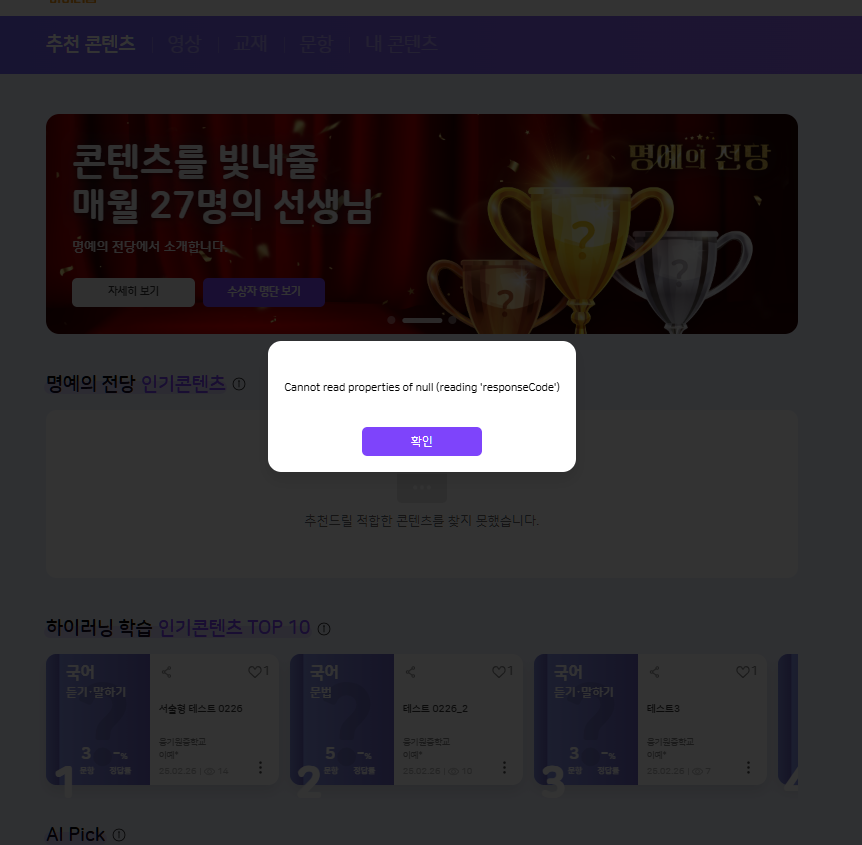 | Description | 교사로 추천 콘텐츠 진입 시 에러 팝업 노출 | ||||