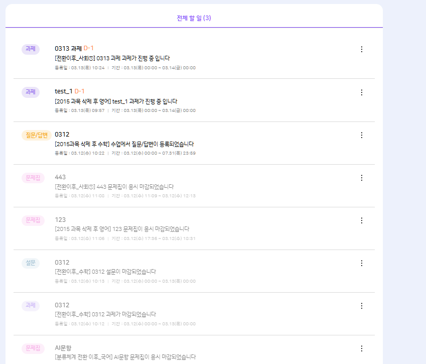 | Steps To Reproduce | 1. 분류중 교사 또는 학생 로그인 2. 메인화면 > 나의 할일 버튼 클릭 3. 3월 5일 이전 자료 클릭 | ||||