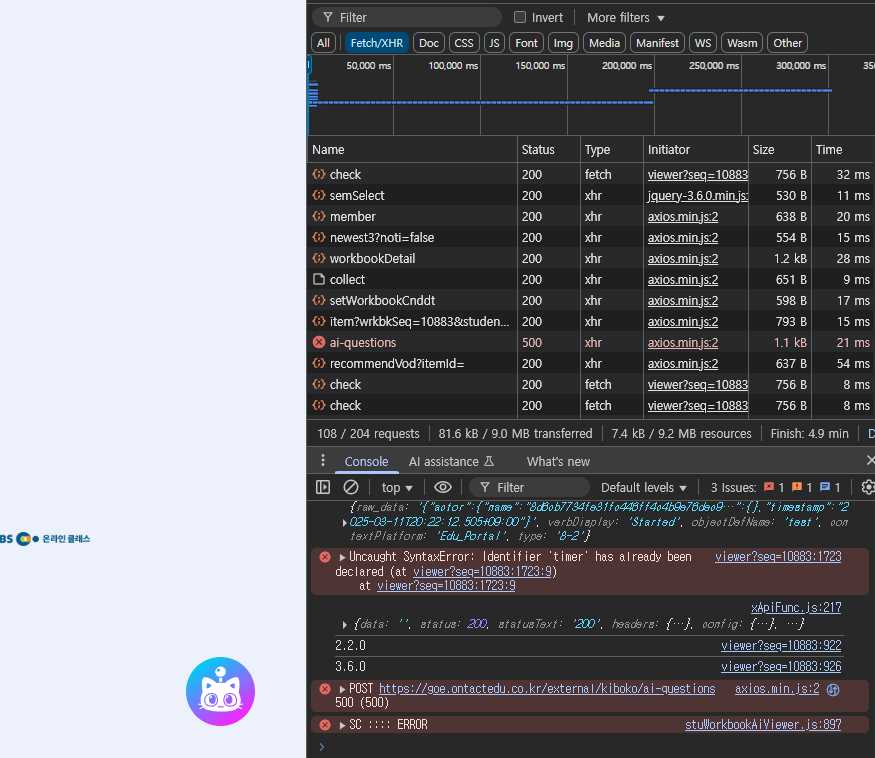 | Summary | 0000563: 문항 > AI출제 문항을 학생이 풀이 시도 시 빈화면 노출 | ||||