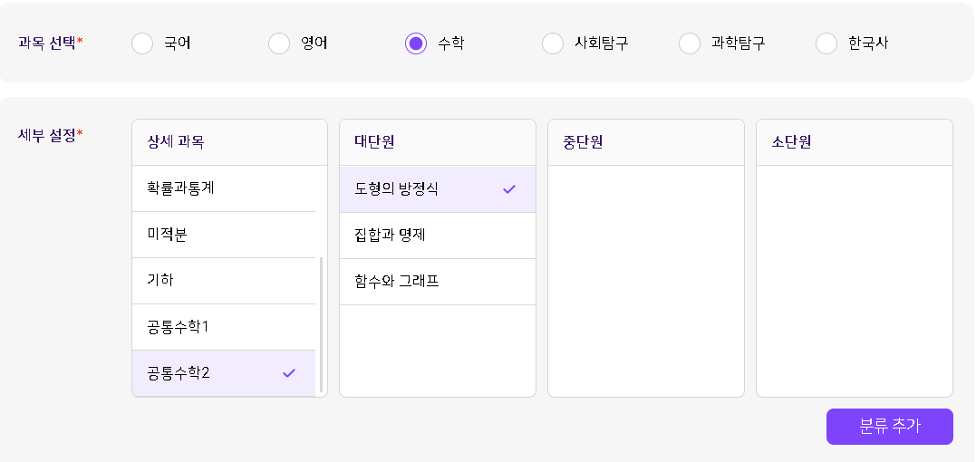| 2025-03-13 15:16 | 김소원 | Summary | 문항 - 선택출제 - 세부설정에서 하위 단원이 노출되지 않아 분류 추가 할 수 없는 현상 발생 => 문항 - 선택출제 - TB와 상용의 분류 개수가 다름 |