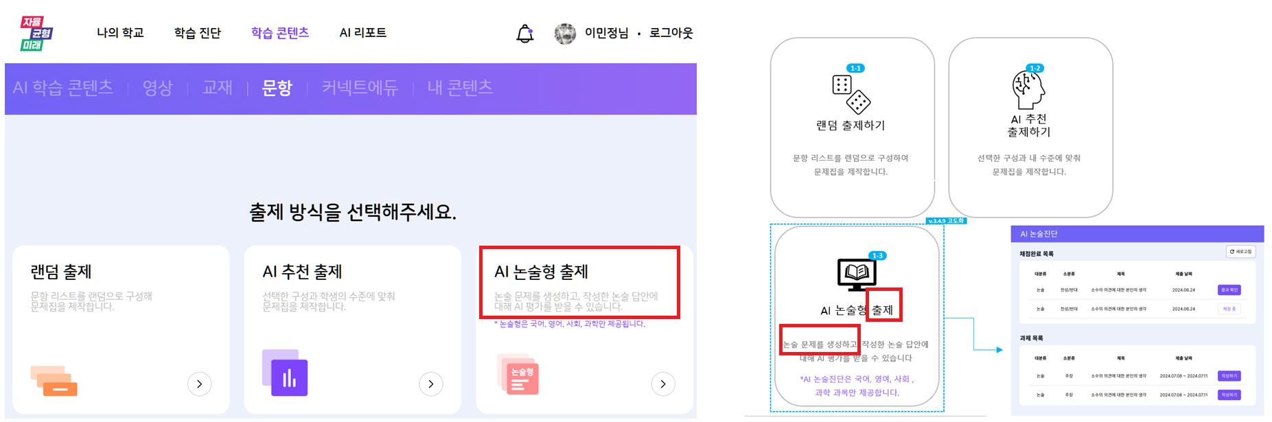 | Description | 학생 - 문항 AI 논술형 출제 버튼의 버튼명 및 안내 문구 확인 필요 1. 출제 : 학생이 직접 출제 할 수 없음 2. "논술 문제를 생성하고" 문구 확인 필요 | ||||