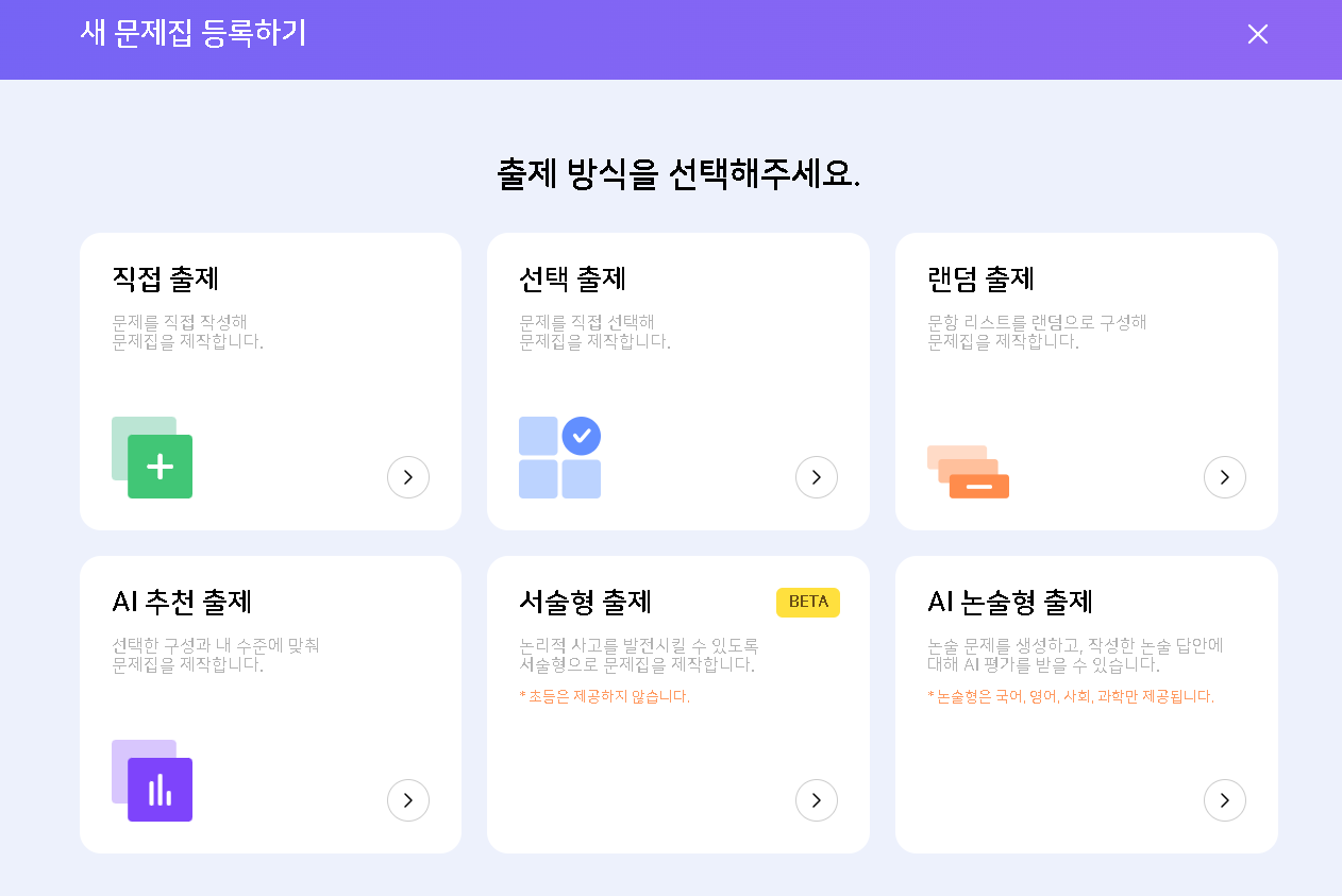 | Description | 학습 콘텐츠 - 문항 - 등록하기 - 출제 방식 선택하기 페이지에 서술형 출제, AI 논술형 출제 아이콘 없어짐 | ||||