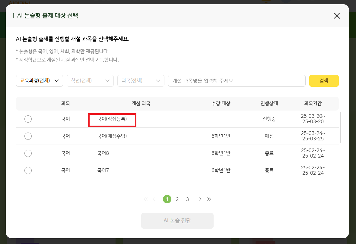 | 2025-03-20 08:35 | 이세희 | Summary | [ECP] AI 논술형 출제하기 > 수강 대상 '직접 등록'으로 생성한 과목도 노출됨(초중) => [ECP] AI 논술형 출제하기 > 수강 대상 '직접 등록'으로 생성한 과목도 노출됨 |