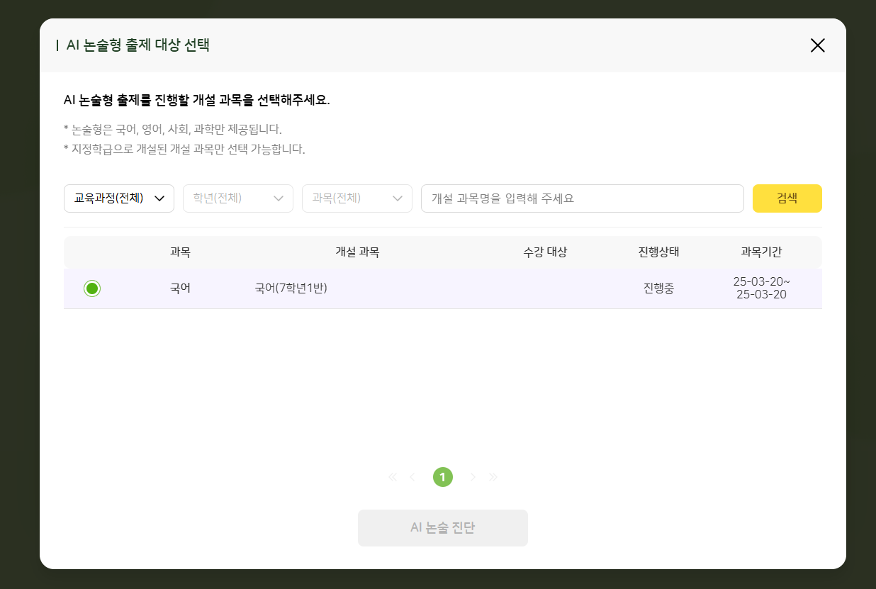 | Description | [ECP] AI 논술형 출제하기 > 수강 대상 '지정 학급 7학년'으로 생성한 과목도 노출됨 | ||||