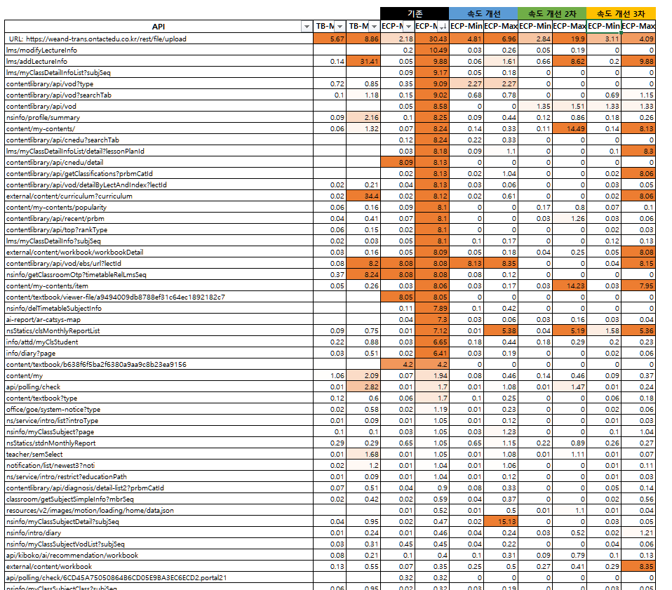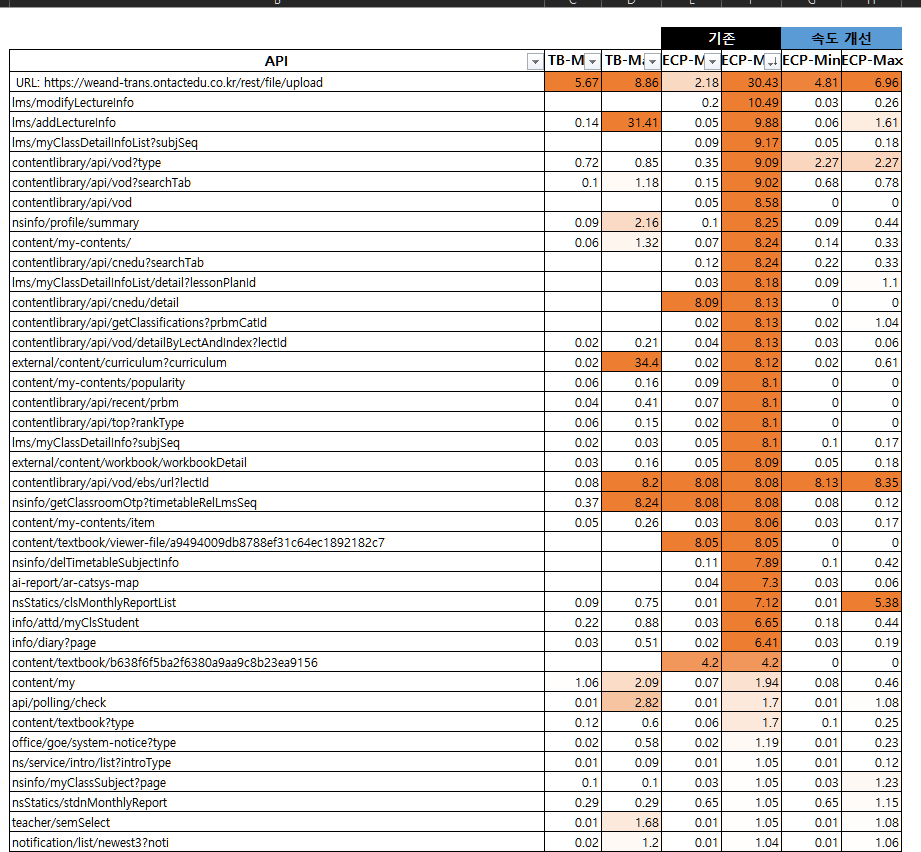 현재 신규 이슈 발생으로 정확하지는 않지만 이전보다 속도가 많이 개선되었습니다. 상세한 항목은 첨부한 엑셀에서 확인 부탁드립니다. |