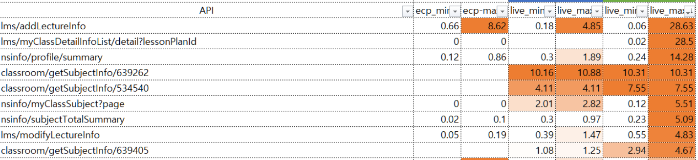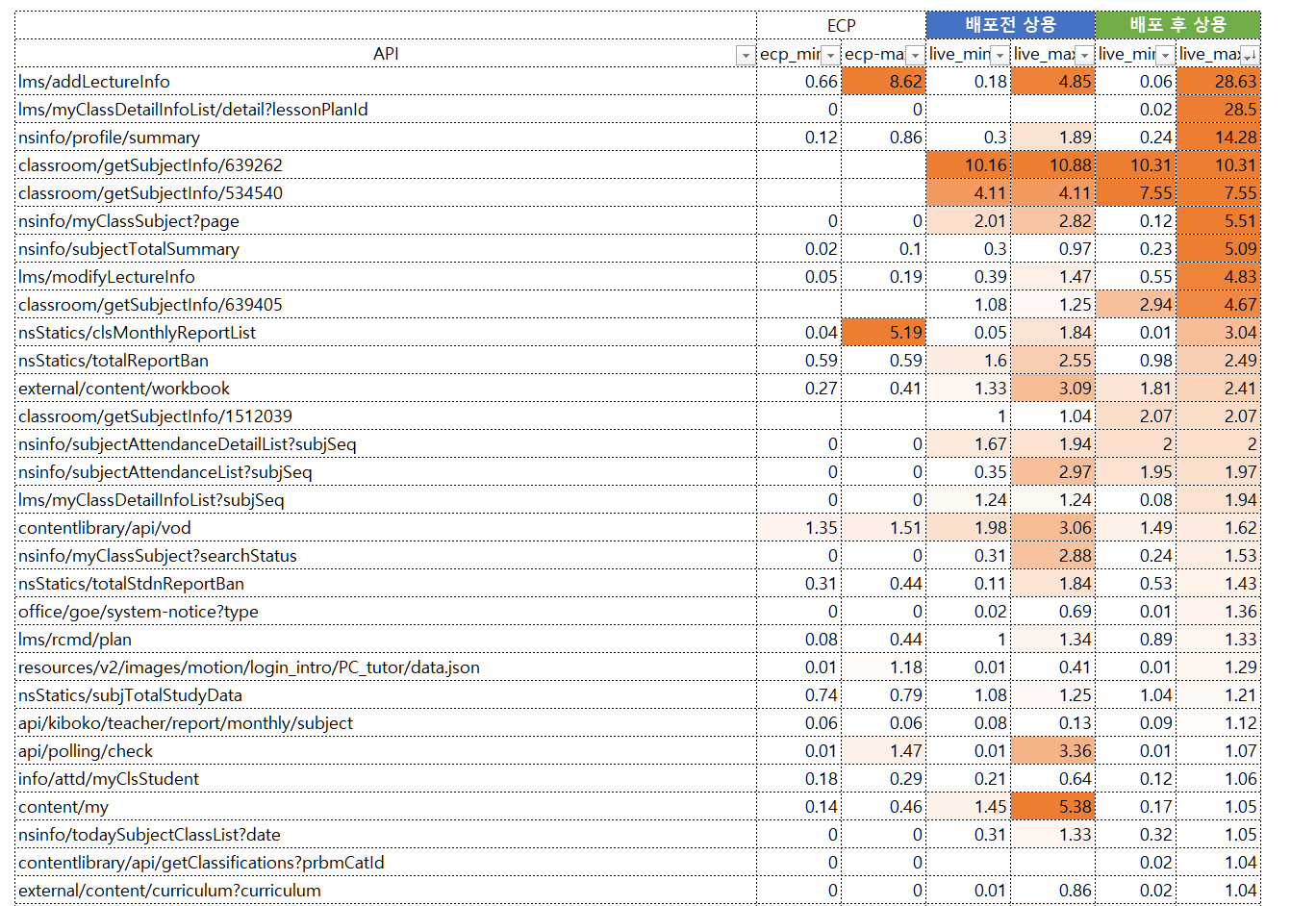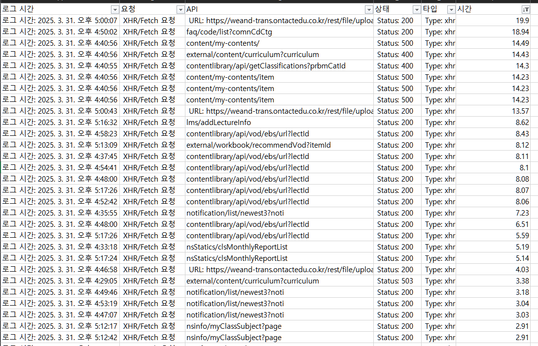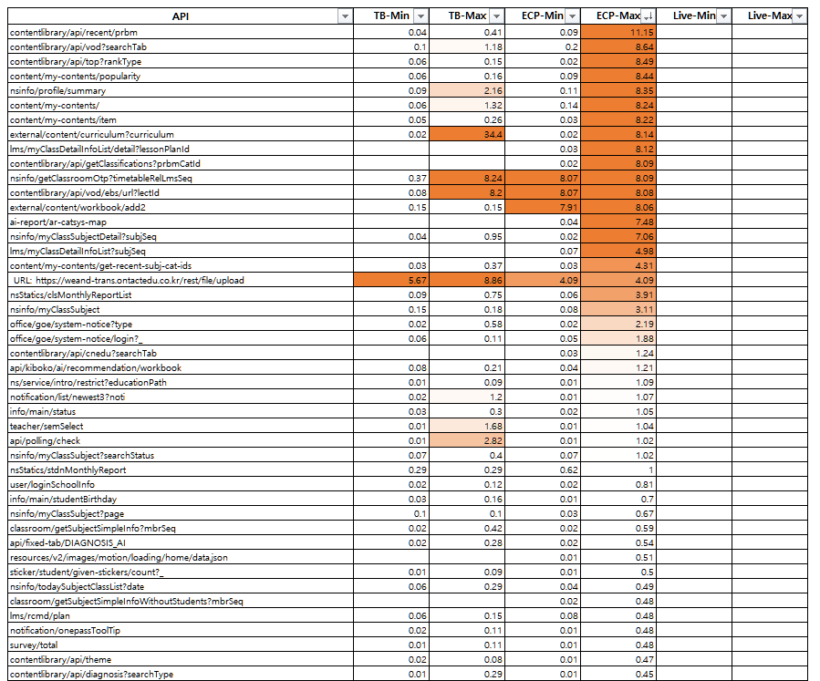 위 김소원 과장 속도 이슈관련 확인 결과입니다. 1. PRD 환경 테스트 체감은 전반적으로 느리지 않음 2. 4월 5일 11시 ~ 6일 9시 오전까지 시험 진행했으며 통창 마이그레이션 시간은 피함(5일 23시 이후~6일 9시전까지는 로그 수집 안함) 3. 서비스 시간 지연이 max로 나온 시간대는 5일 22시 30분 ~ 23시 근방으로 통창 시험 시간과 겹침 추가 검증 방법: - 일부 max 지연은 추가 통창 시험 시간과 약간 겹쳐서 발생된 것으로 보임(5일 23시 근방) - 사용자 / 퍼닌 / ECP를 거침으로 각 구간별 소요 시간 측정 방안 필요 - classroom API는 시험자들이 시험중 시험자료를 많이 만듬으로써 10초대 지연이 생기는것으로 보임 |
