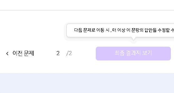 | Description | 학습콘텐츠>문항>문제풀기 마지막 문제 최종결과지 보기 버튼에 호버하면 "다음 문제로 이동시, 더이상 이 문항의 답안을 수정할 수 없습니다"라는 툴팁 발생 | ||||