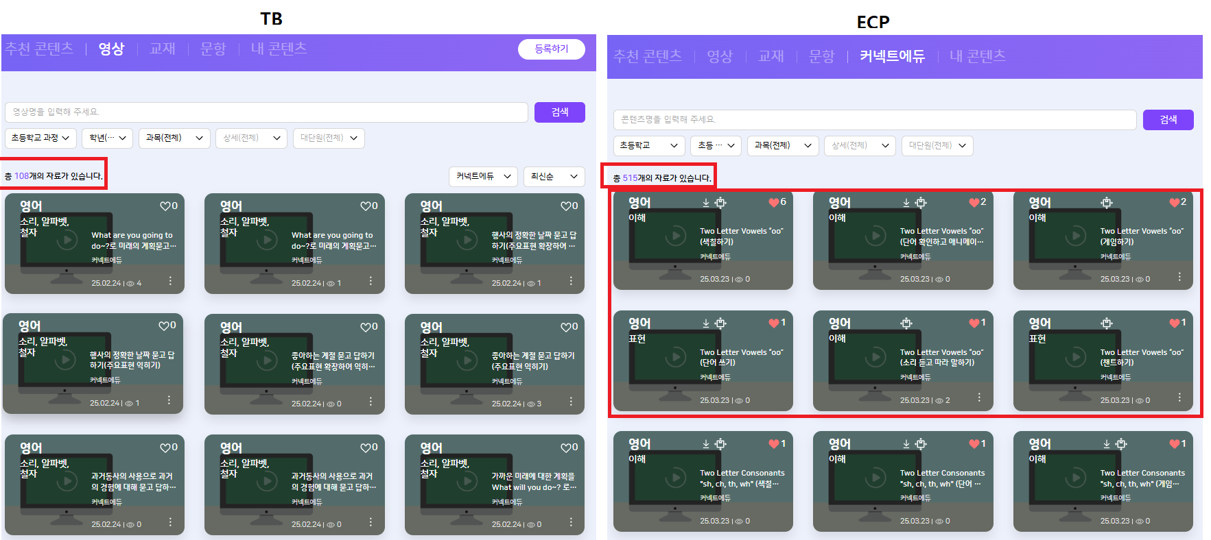 현재 ECP/TB를 비교할 수 없는 상태로 상용과 비교 시 개수 동일합니다. 5학년 262개 6학년 253개 해당 이슈는 해결 처리하겠습니다. |