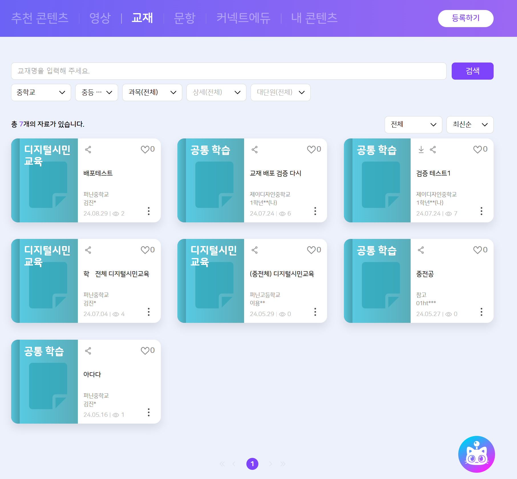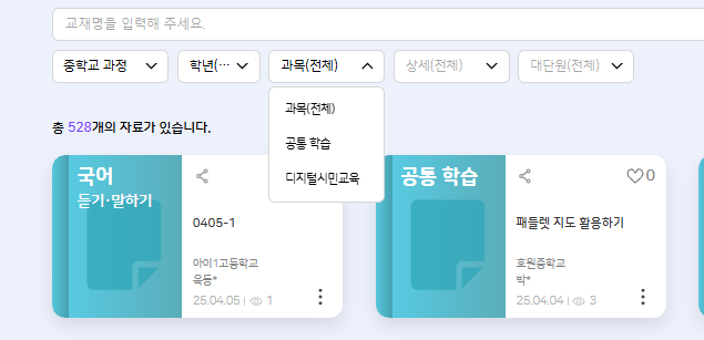 교제 > 필터(중학교 , 학년(전체) 시 노출 자료는 공통학습과 미디어시민교육만 노출됨 --> 각학년별로 과목에 대한 데이터 정상 노출 되며 학년 전체를 아우르는 과목이 없으므로 학년 전체에 공통학습 과 디지털시민교육만 있는것이 맞음 |