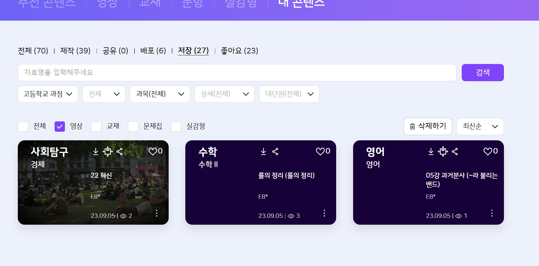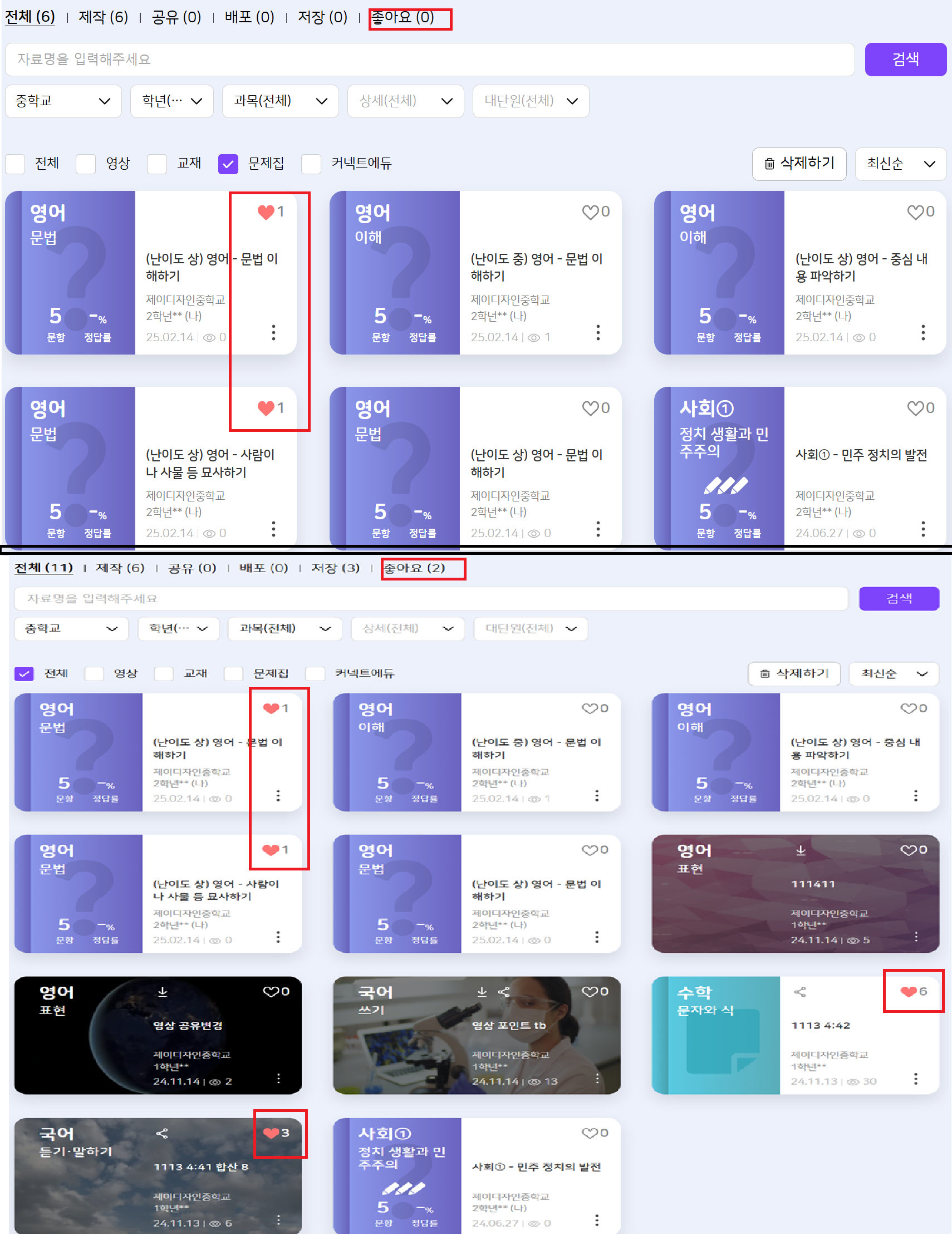 내 콘텐츠 교과과정(초중고), 콘텐츠별(영상,교재,문제집,커넥트에듀) 필터 변경시 저장&좋아요 수 일치 하지 않음 위의 이유로 reopen 하겠습니다. |