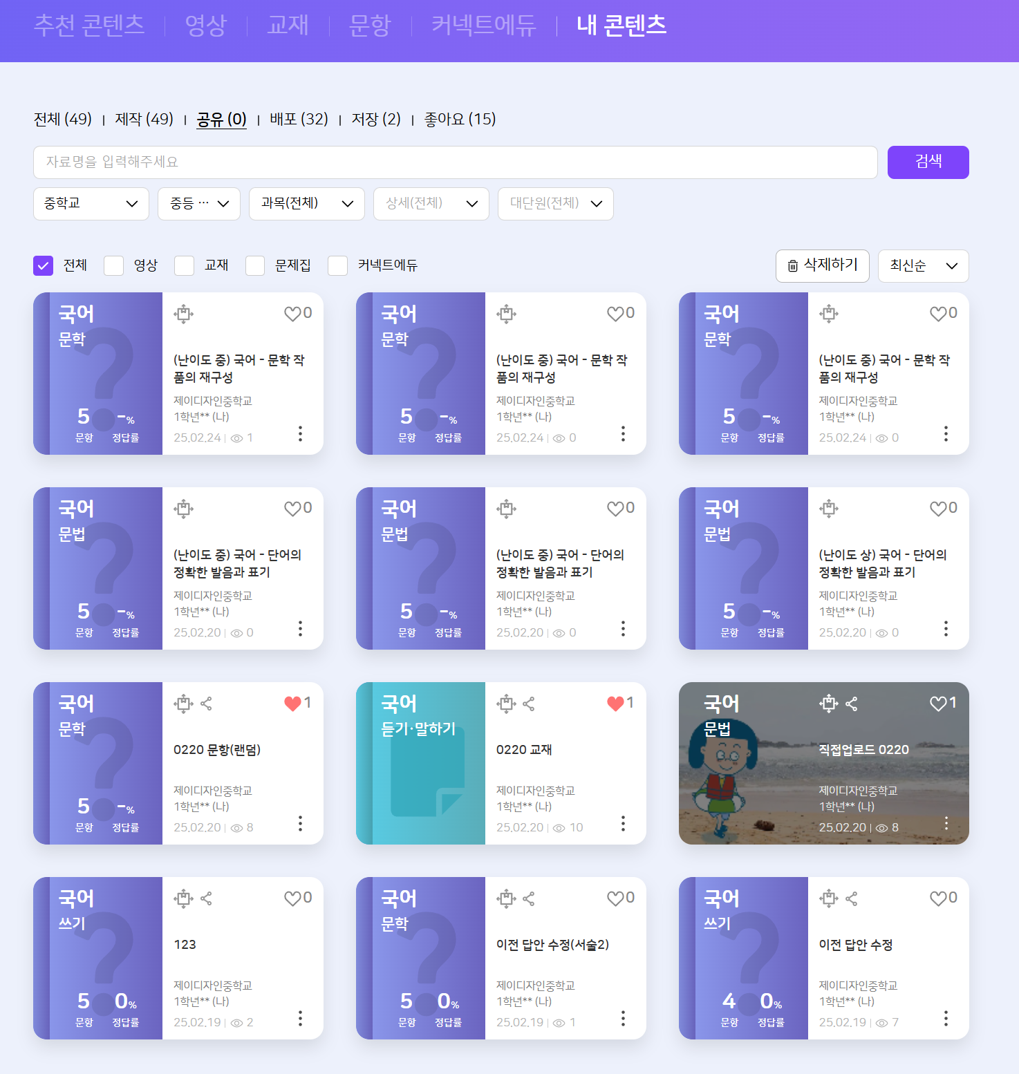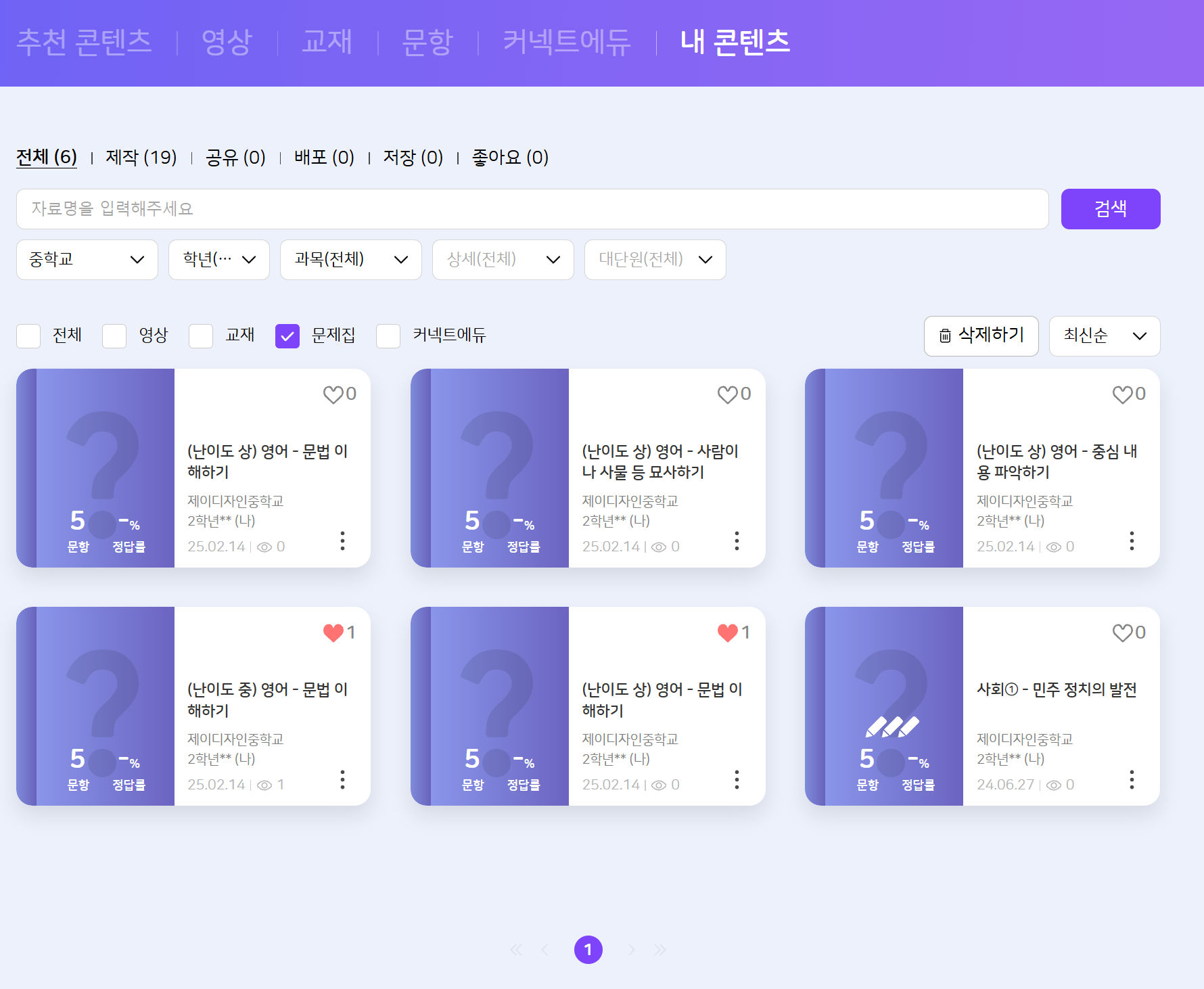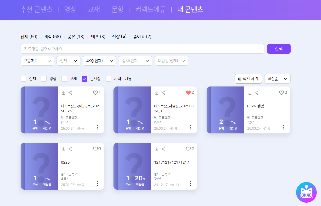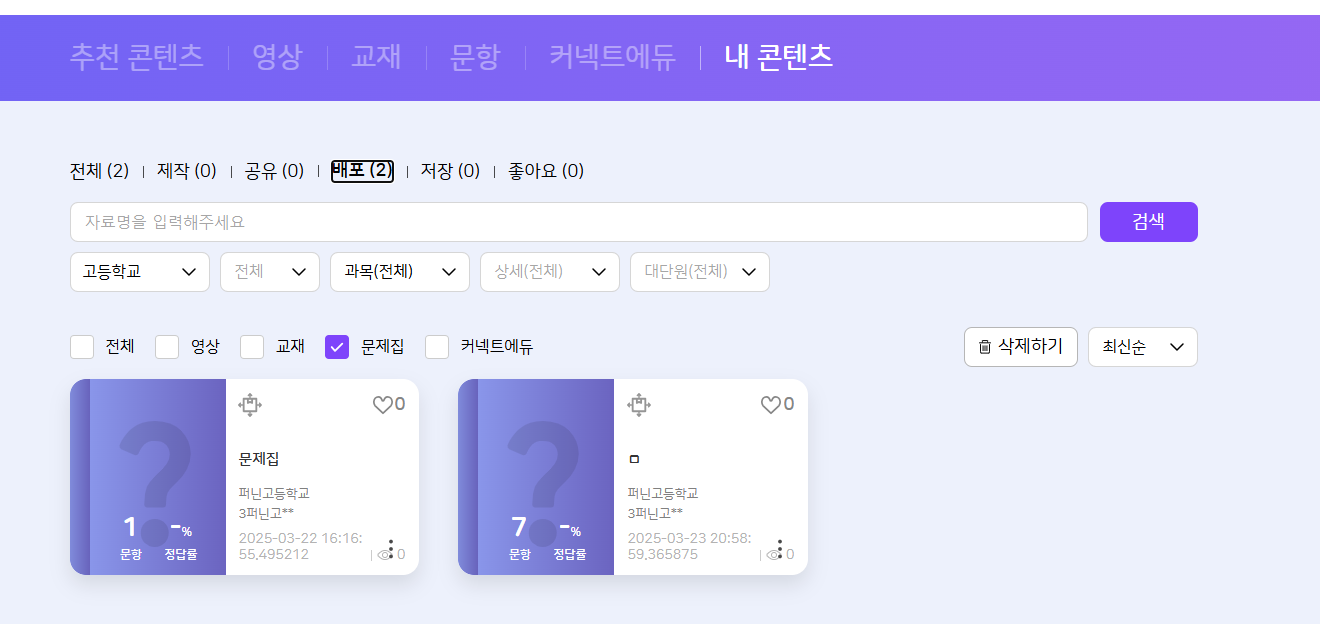 계정 : jw02 내 콘텐츠- 전체 - 문제집 필터 적용시 카운트 수와 화면단이 상이함 |