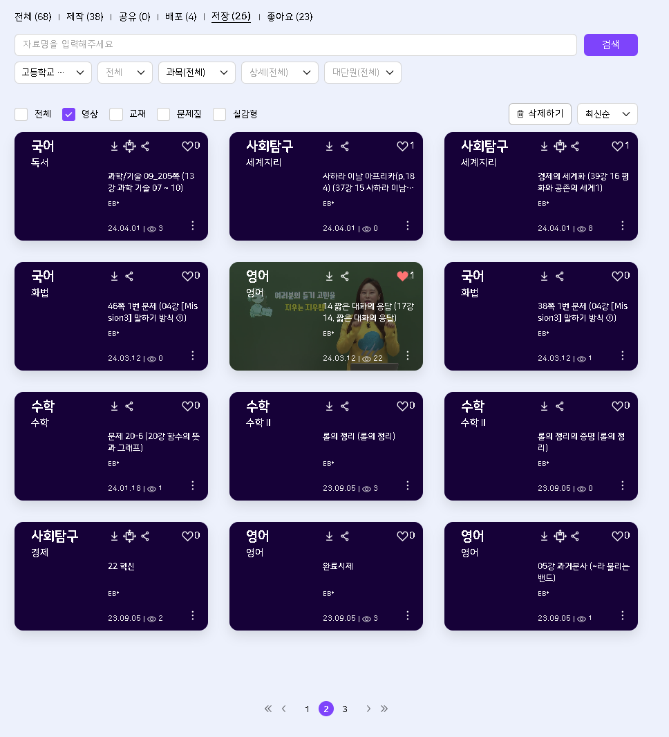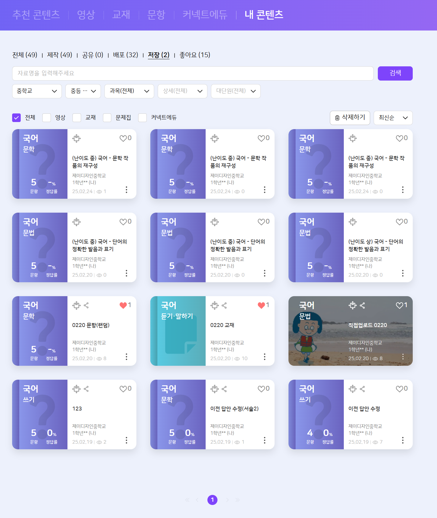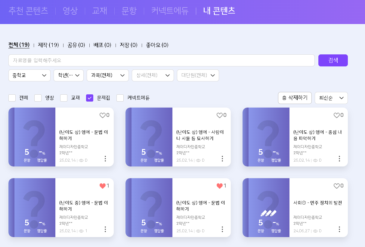계정 : jw02 내 콘텐츠- 전체 - 문제집 필터 적용시 카운트 수와 화면단이 상이함 |