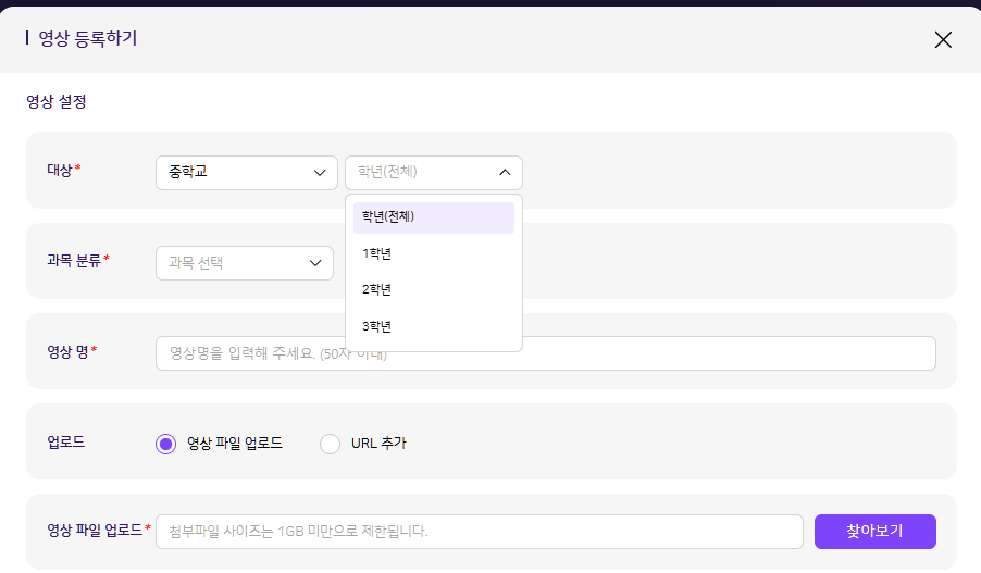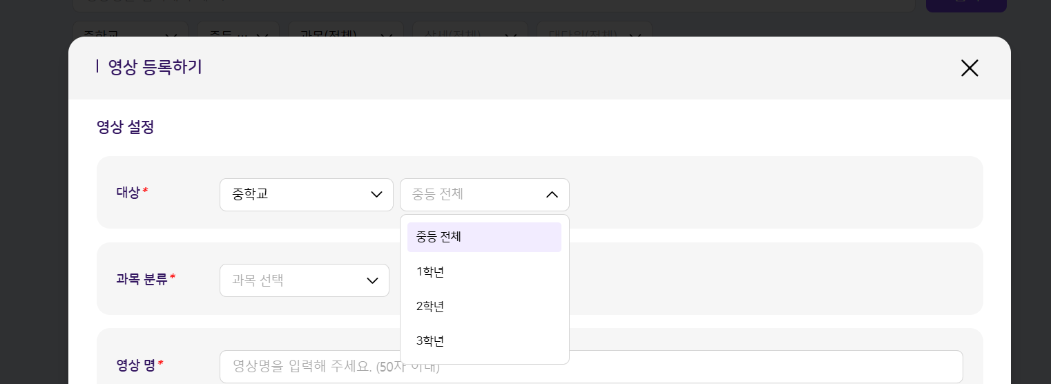 | Steps To Reproduce | 1. 학습 콘텐츠 > 영상,교재,문항 > 등록하기 2. 대상 : 초등학교 선택 > 학년 선택 필터 응시 3. 대상 : 중학교 선택 > 학년 선택 필터 응시 | ||||
