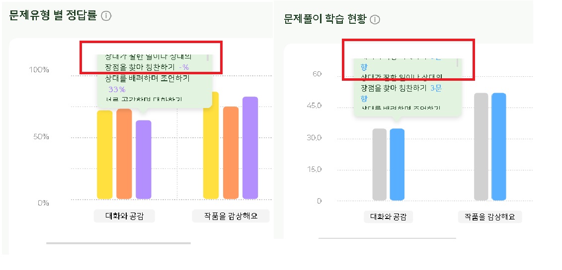 | Description | AI리포트>과목리포트 문제풀이 학습 현황의 '대화와 공감','글을 요약해요'과목, 문제유형 별 정답률의 '대화와 공감-심화문제' 막대그래프 툴팁이 잘리는 현상 | ||||