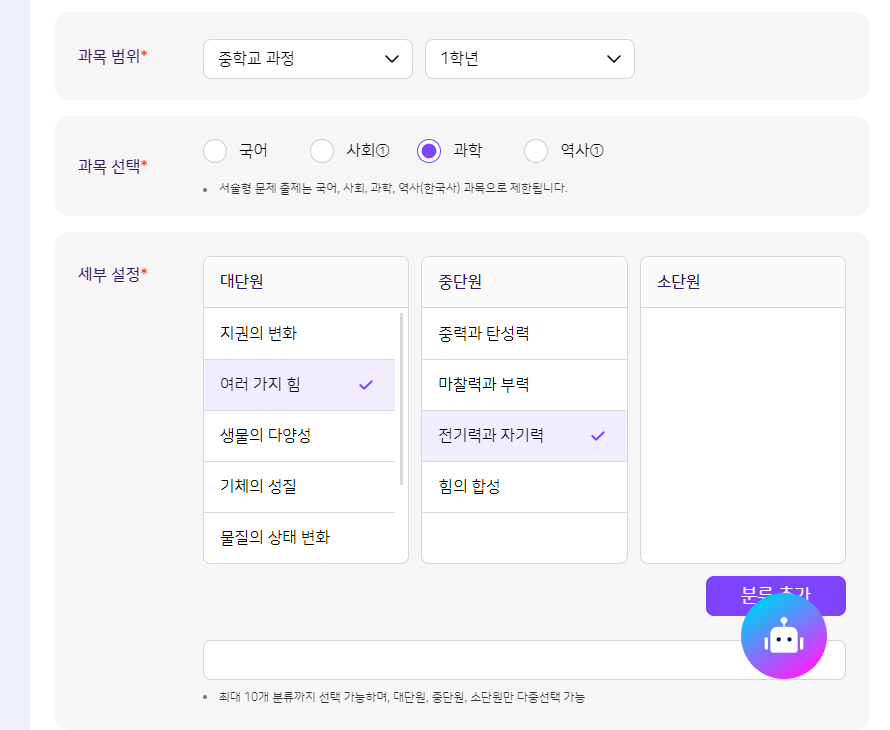 | Steps To Reproduce | 1. 학습 콘텐츠 > 문항 2. 등록하기 > 랜덤, 선택, 서술, AI추천 선택 3. 중학교 1학년 > 과학 > 여러 가지 힘 > 전기력과 자기력 선택 4. 소단원 노출 확인 | ||||