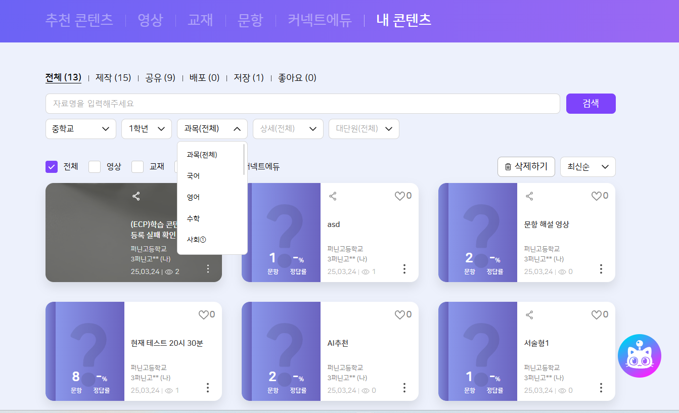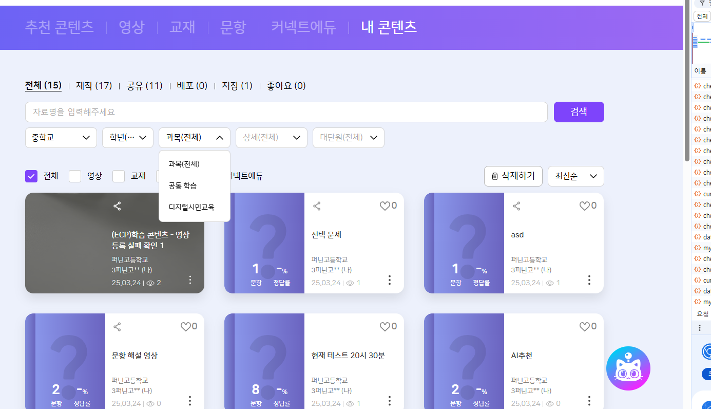 | Description | (ECP)내 콘텐츠 - 콘텐츠 카드에 과목 분류 노출 안되는 현상 콘텐츠 카드에 영어, 국어, 수학 등 과목 분류 노출되어야함 | ||||