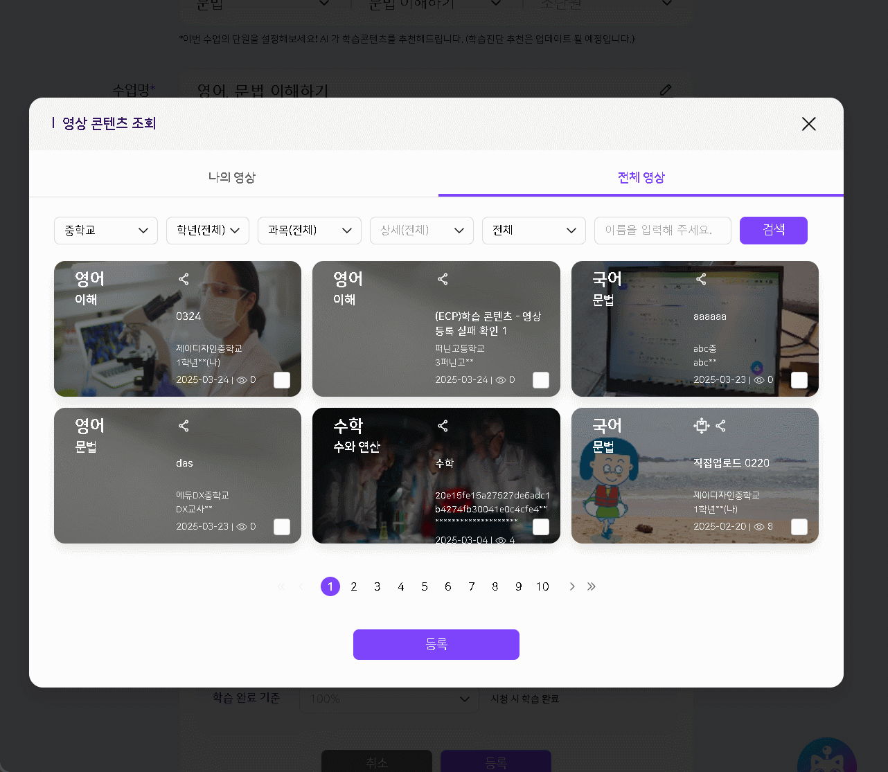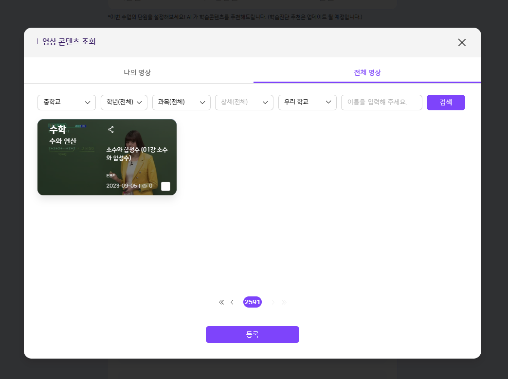 | Steps To Reproduce | 1. 나의 수업 > 수업 설계 > 영상 > 영상 콘텐츠 조회 > 전체 영상 2. 출처별 필터(EBS, e학습터, 경기도 교육청 등) 선택 3. 응시 | ||||