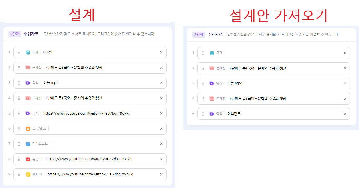 | Steps To Reproduce | 1. 수업자료 포함하여 수업 설계 2. 수업 설계안 가져오기 3. 수업자료 확인 | ||||