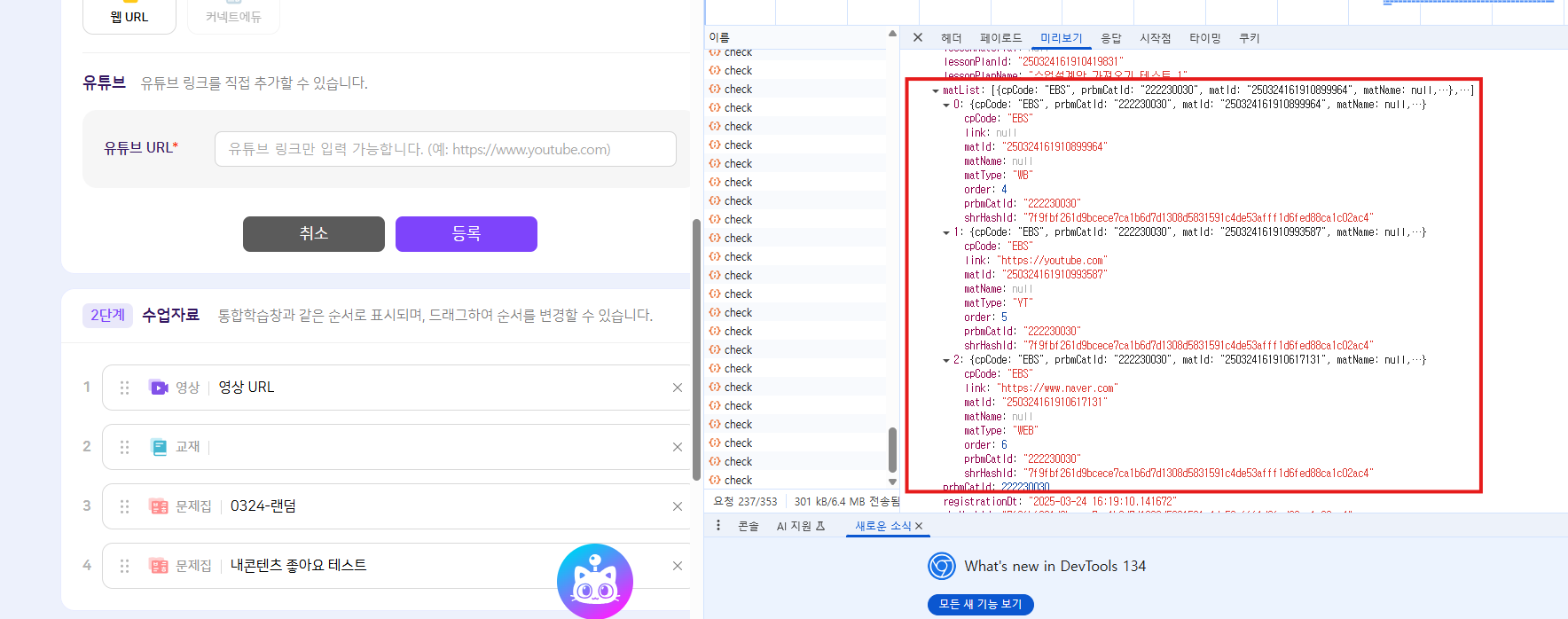[03-24 16:32 GNEW] : 수업설계안 가져오기 후 기타 수업자료에 대한 내용이 반환되고 있음을 확인하였습니다. 포탈쪽에서 기타자료를 노출하는 부분의 로직 확인이 필요할 것 같습니다. |