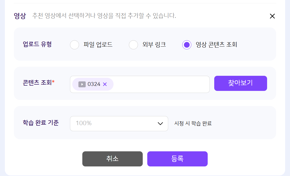 | Description | (ECP)수업설계-자료첨부(영상,교재,문제집)시 [취소] 버튼 클릭해도 초기화 되지 않은 현상 1. 영상/교재/문제집에서 업로드 유형 선택 후 취소 or X 버튼 클릭시 선택 해제 후 디폴트 버튼 선택 되어 있어야함 2. 영상/교재/문제집에서 자료 추가 후 [등록] 누르지 않은 상태에서 [취소]버튼 클릭 시 자료 삭제 및 초기화 되어야함 | ||||