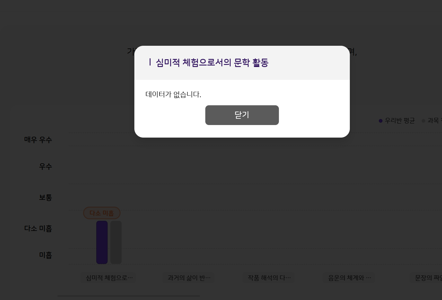 | Steps To Reproduce | 1. 과목 리포트 > 우리반 > 과목별 리포트 > 국어 2. "심미적 체험으로서의 문학 활동" 막대 그래프 클릭 | ||||