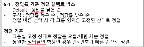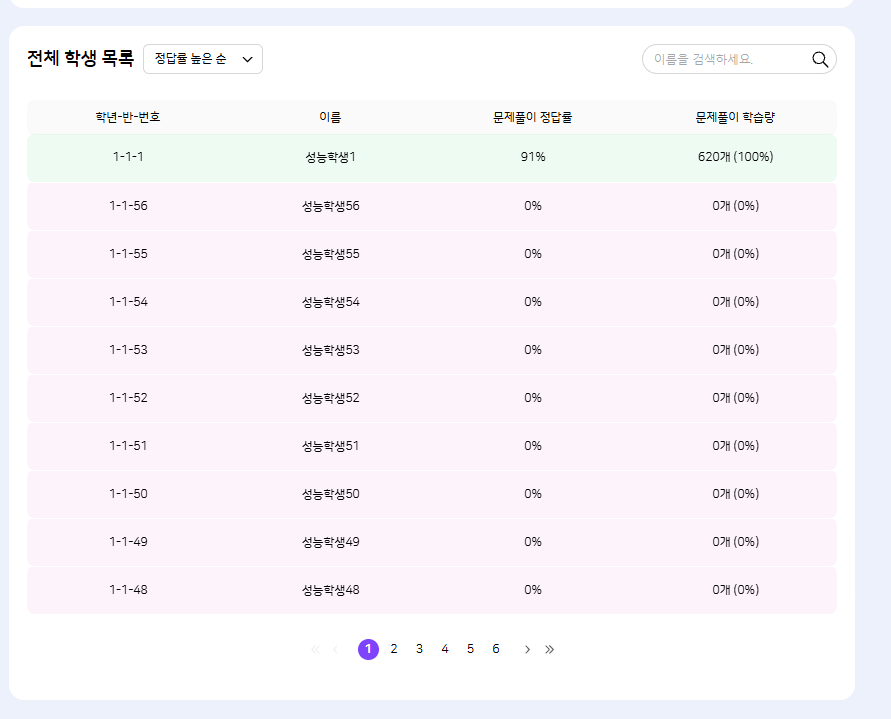 데이터가 있는 학생들은 "최상단"에 노출되어야합니다. 정답률 낮은 순 필터로 전환시에 데이터가 있는 학생들이 최상단에서 데이터가 있는 학생들끼리 순서 전환이 이루어져야 합니다. |
