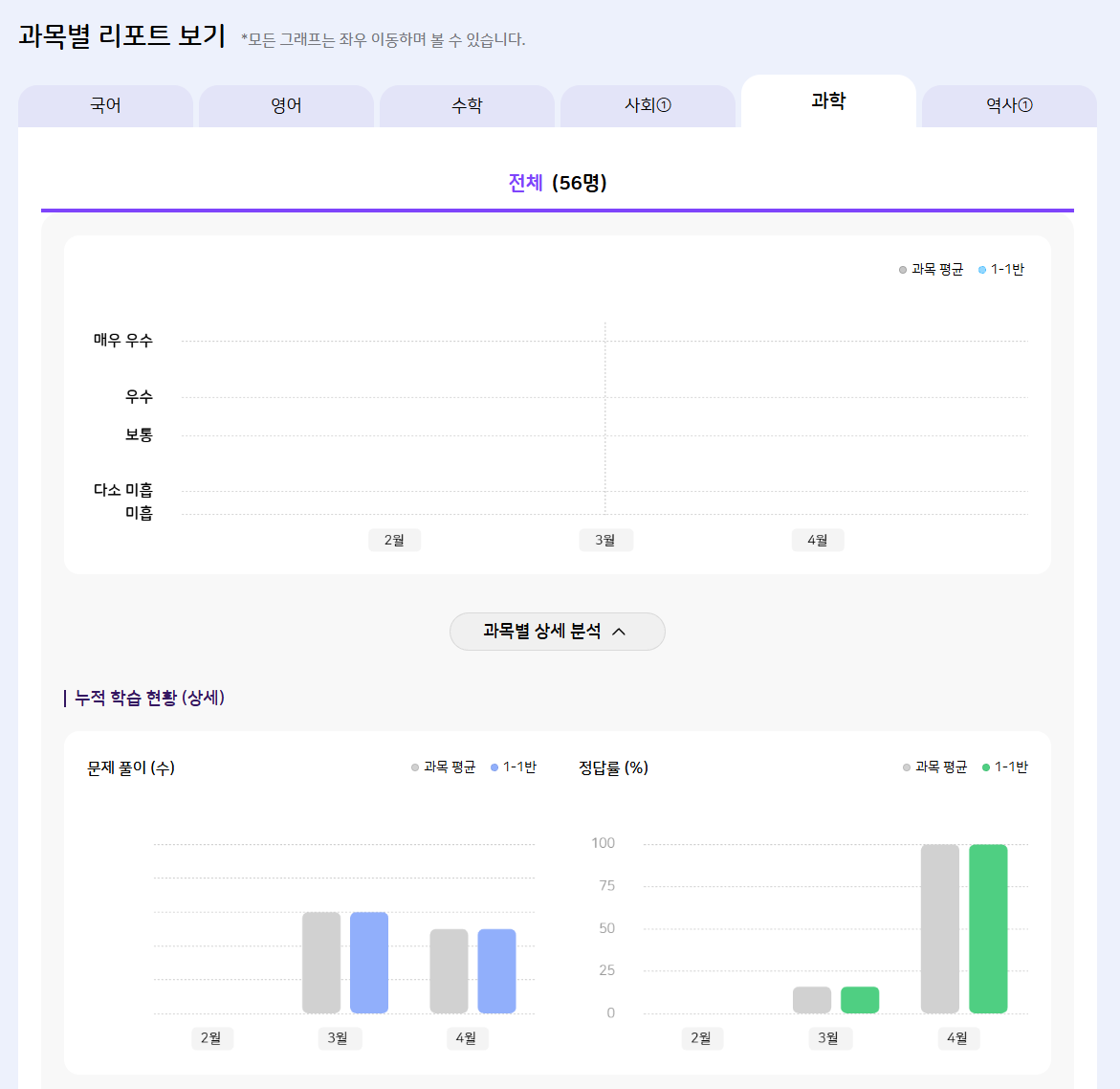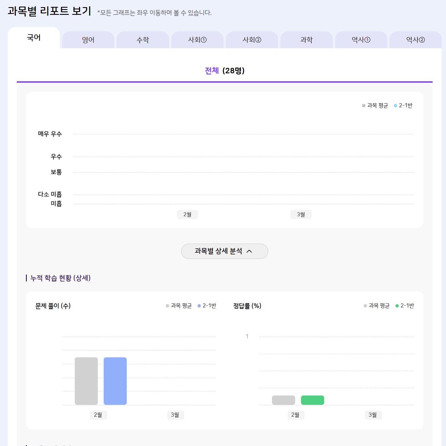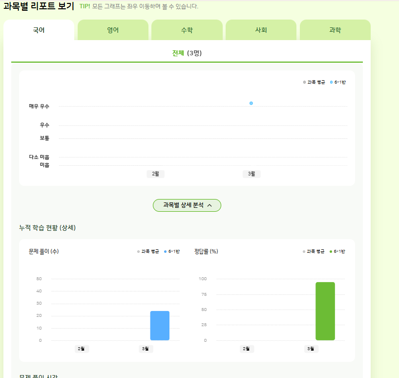 계정 : 25test1 과목별 리포트 보기 그래프 노출안됨. |
