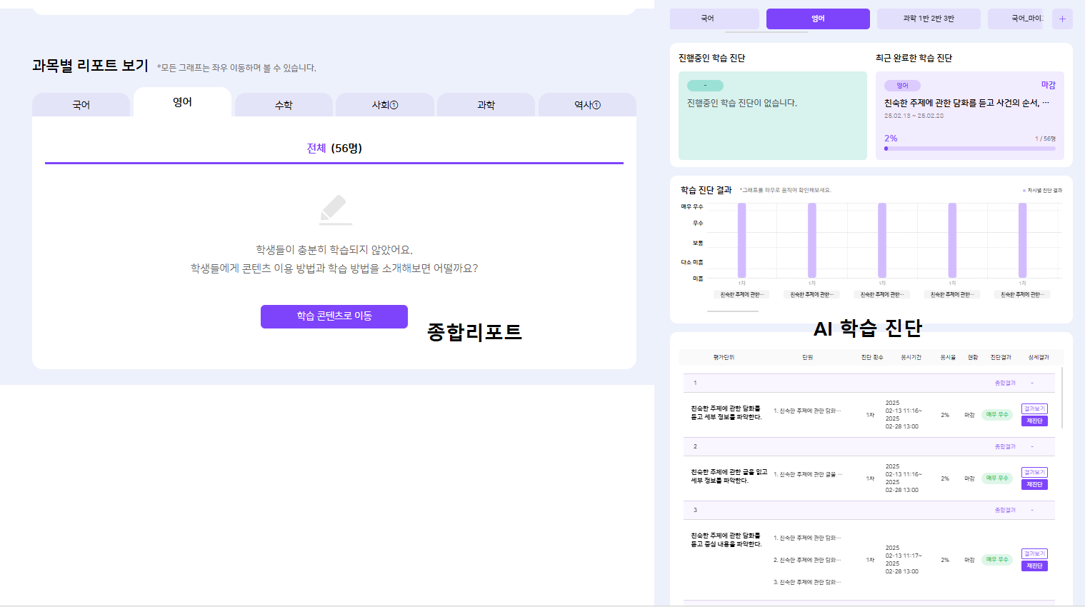 TB = 기존 데이터 이상으로 신규 학교 생성으로 체크하고 해결로 변경 상용 = 종합리포트의 영어탭을 따로 스크린샷 촬영하지는 않아 전/후 비교가 어렵습니다. 다만, 진단 결과가 있는데 노출되고 있지 않아 키보코, 분류체계 확인이 필요합니다. |