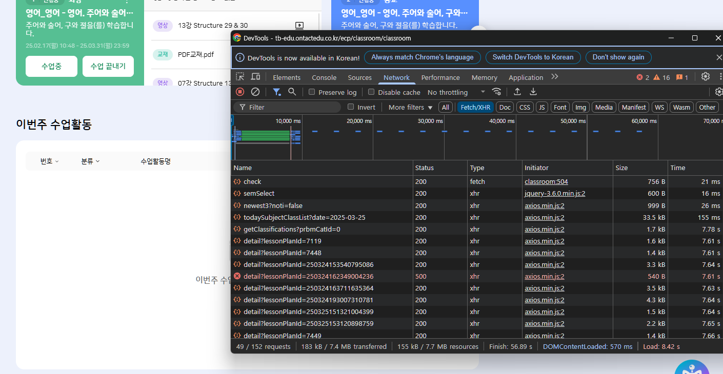 | Description | 나의 교실 > 이번주 수업활동이 정상적으로 노출되지 않는 현상 설계된 수업 중 문제집을 포함하고 있는 수업이 있으나 노출되지 않음 | ||||