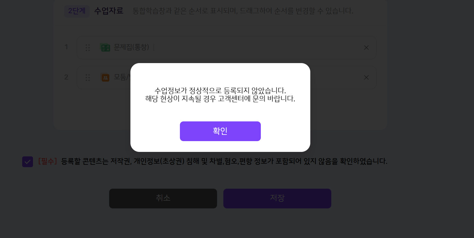 | Description | [ECP] 통창 관련 수업자료로 등록된 수업을 수정하여 통창 관련 수업자료 추가 시 실패 팝업 노출 *통창 관련 자료 유형 : 문제집(통창) 모둠/발표 화이트보드 유튜브 웹URL ex) 문제집(통창) 으로 수업 생성 -> 수정 버튼 누른 후 모둠/발표 추가 -> 실패 팝업 모둠/발표 로 수업 생성 -> 수정 버튼 누른 후 화이트보드 추가 -> 실패 팝업 유튜브 로 수업 생성 -> 수정 버튼 누른 후 웹 URL 추가 -> 실패 팝업 화이트보드로 수업 생성 -> 수정 버튼 누른 후 유튜브 추가 -> 실패 팝업 웹URL로 수업 생성 -> 수정 버튼 누른 후 문제집(통창) 추가 -> 실패 팝업 | ||||