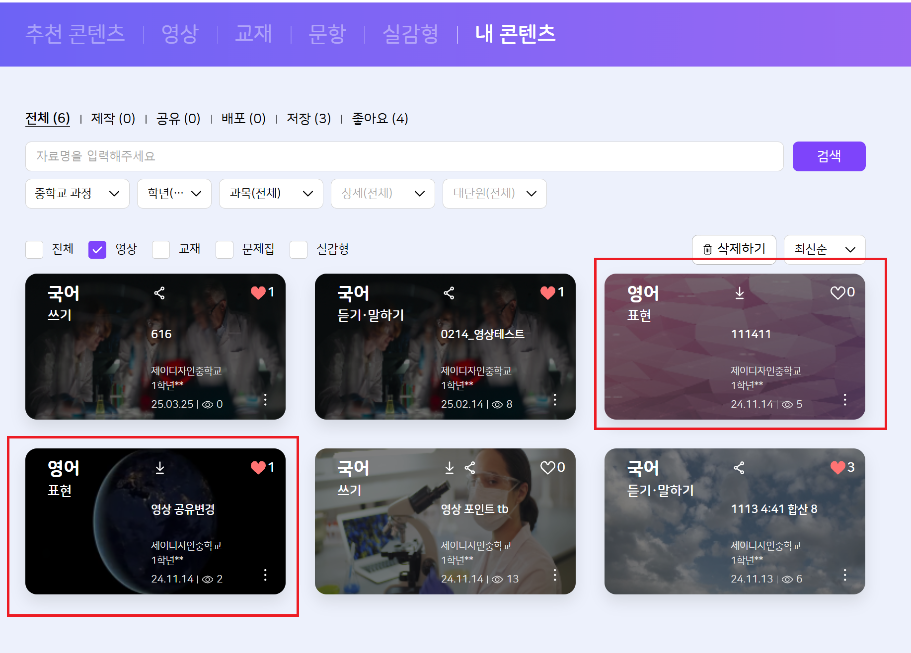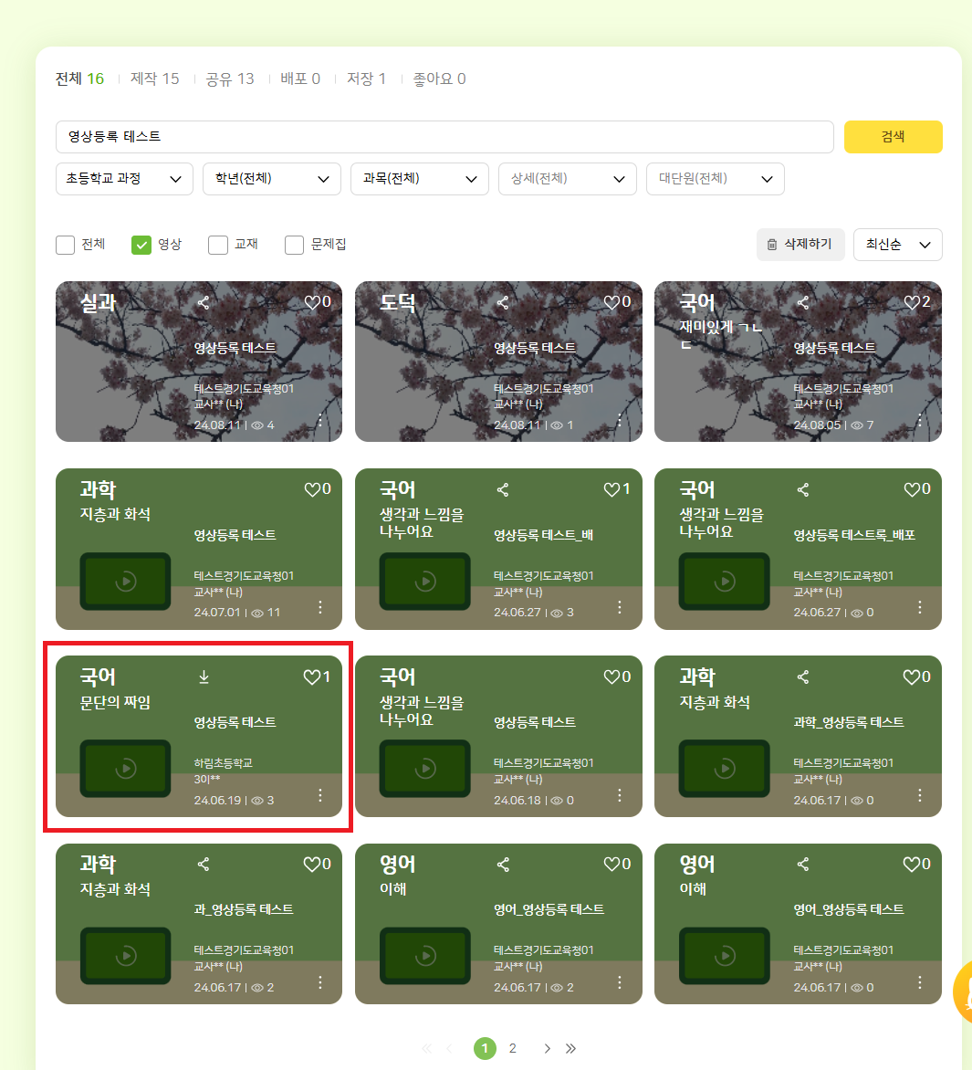 상용 testTC01 학습 콘텐츠 > 내 콘텐츠 > 영상 명: 영상등록 테스트 , 분류체계: 초등학교 과정 상용서버에서 재현됩니다. 확인 부탁드립니다. |