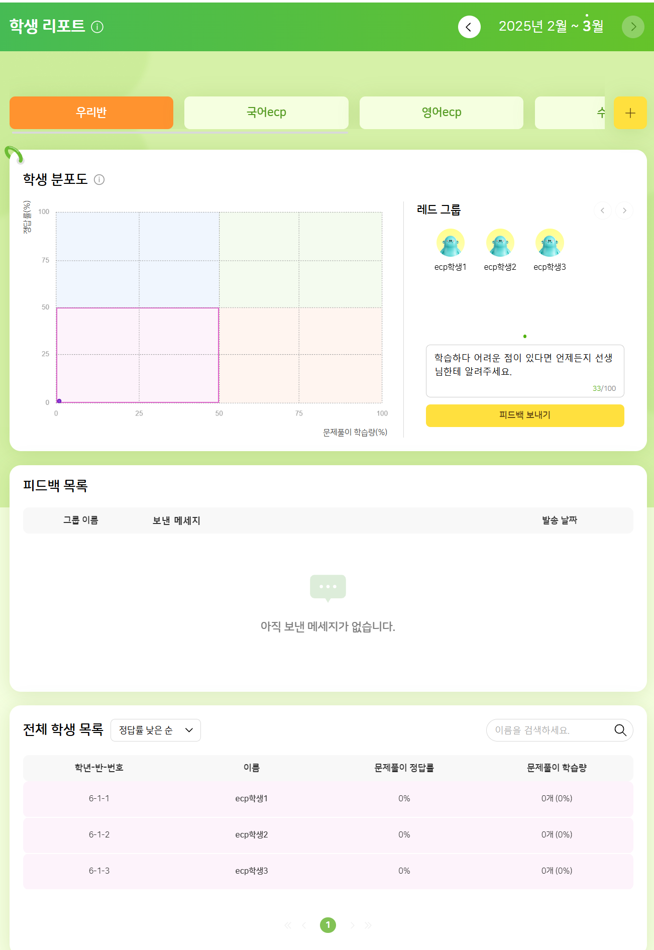 | Description | (ECP)신규 생성 학교 - 학생리포트 데이터 노출 안됨 학교-교사-학생 새로 생성 > AI 학습진단 출제 후 풀이 > 배치 요청 > 데이터 확인 했으나 반영 안됨 | ||||