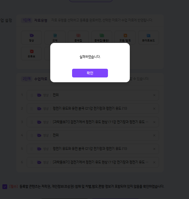 * 현재 동일한 영상 중복으로 업로드 불가 1. 영상 제거를 2단계 수업자료 영역에서만 할 수 있어 영상 재클릭 후 등록 버튼 클릭 시 영상을 추가해 달라는 팝업이 노출됩니다. 메일로 전달받은 내용과 달라 기획확인이 필요합니다. |