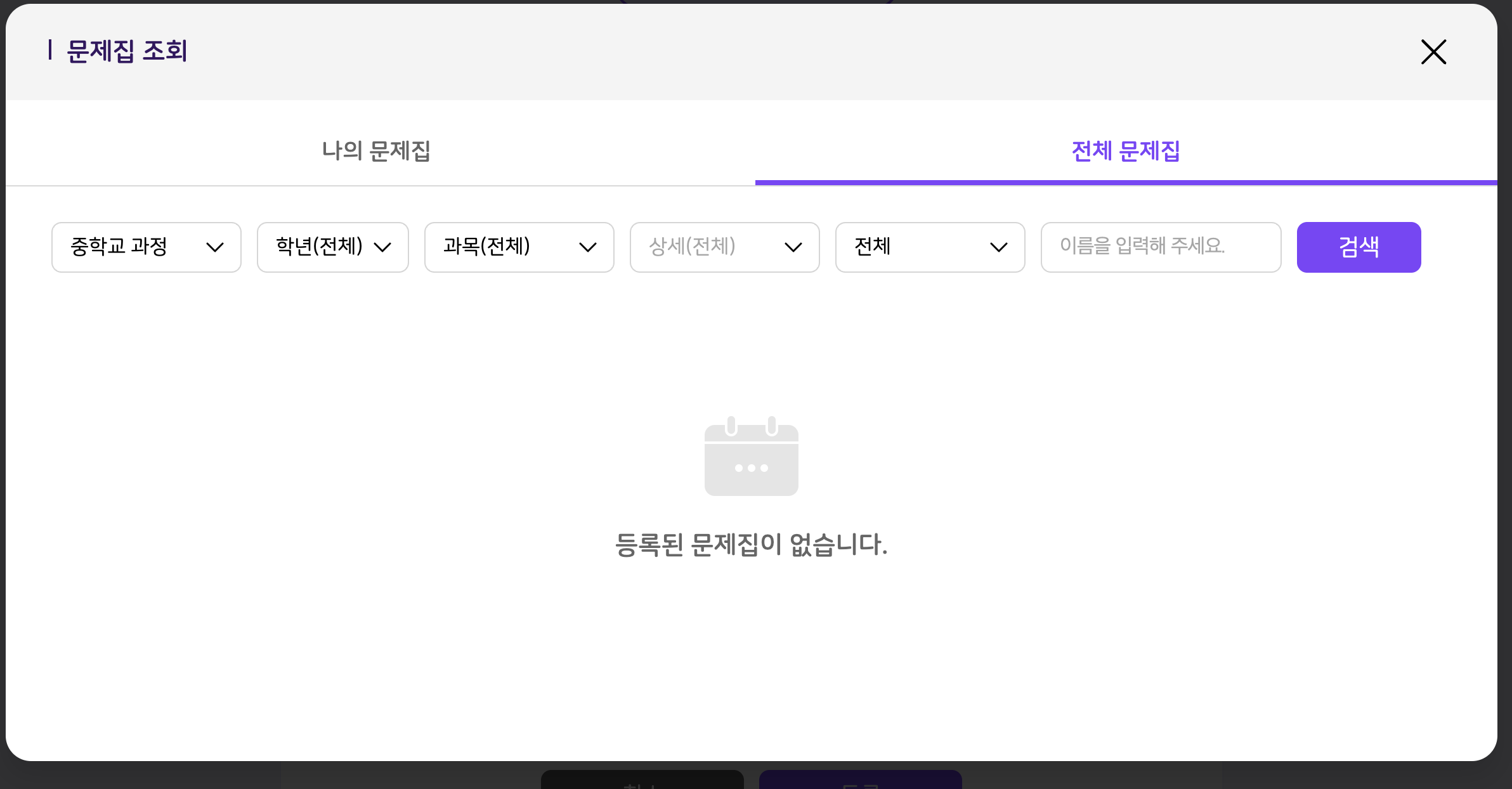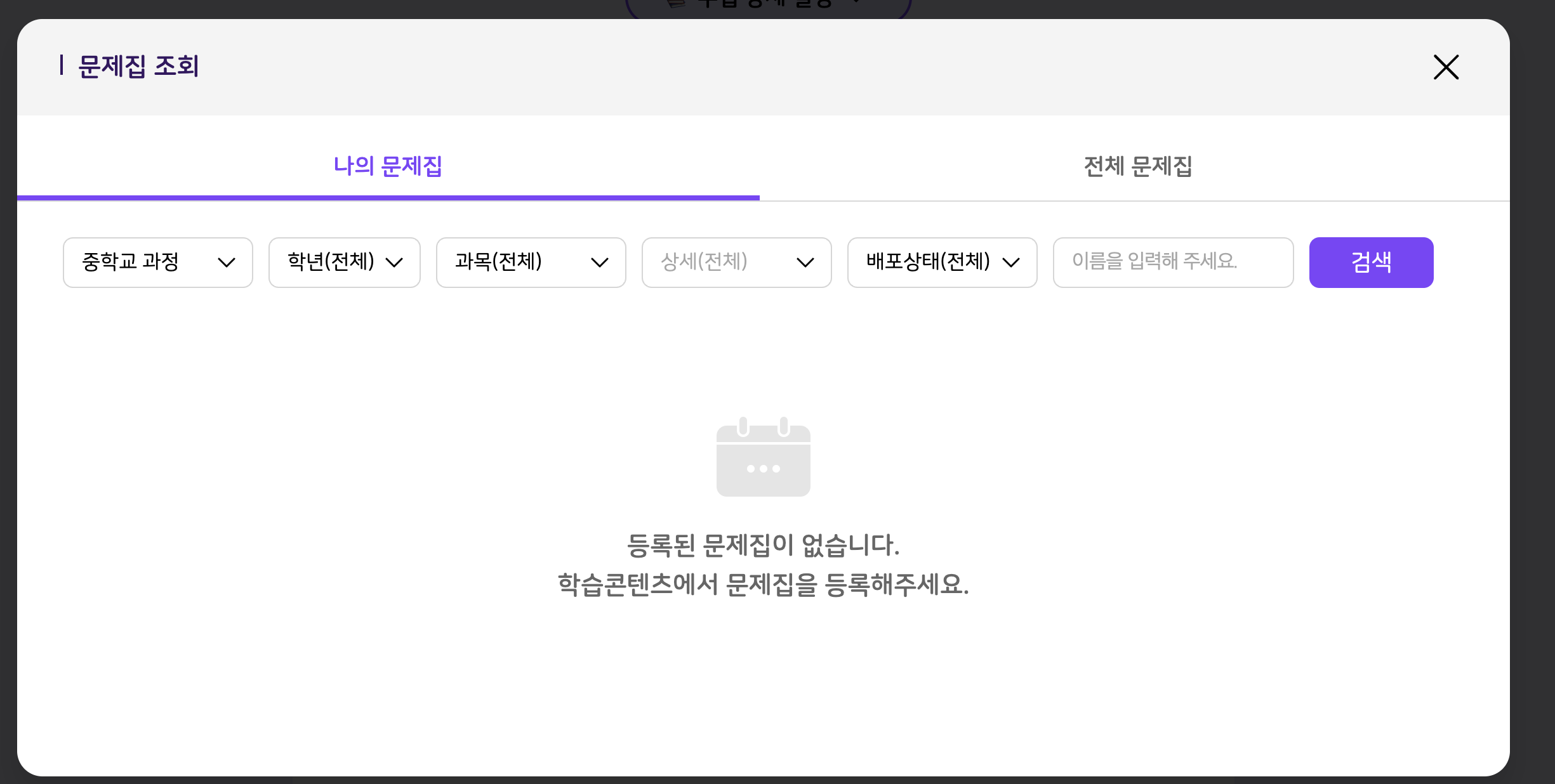 | Summary | 0000725: [ECP] 수업 설계 시 문제집 조회 > '데이터 없음'에 대한 기획 유무 여부 | ||||