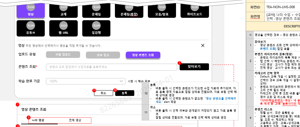 | Description | [ECP] 수업 설계 시 영상 콘텐츠 등록에 대한 등록/취소 버튼 정의가 기획에 없음 기획서 : (2025-03-25) myclass p125 | ||||