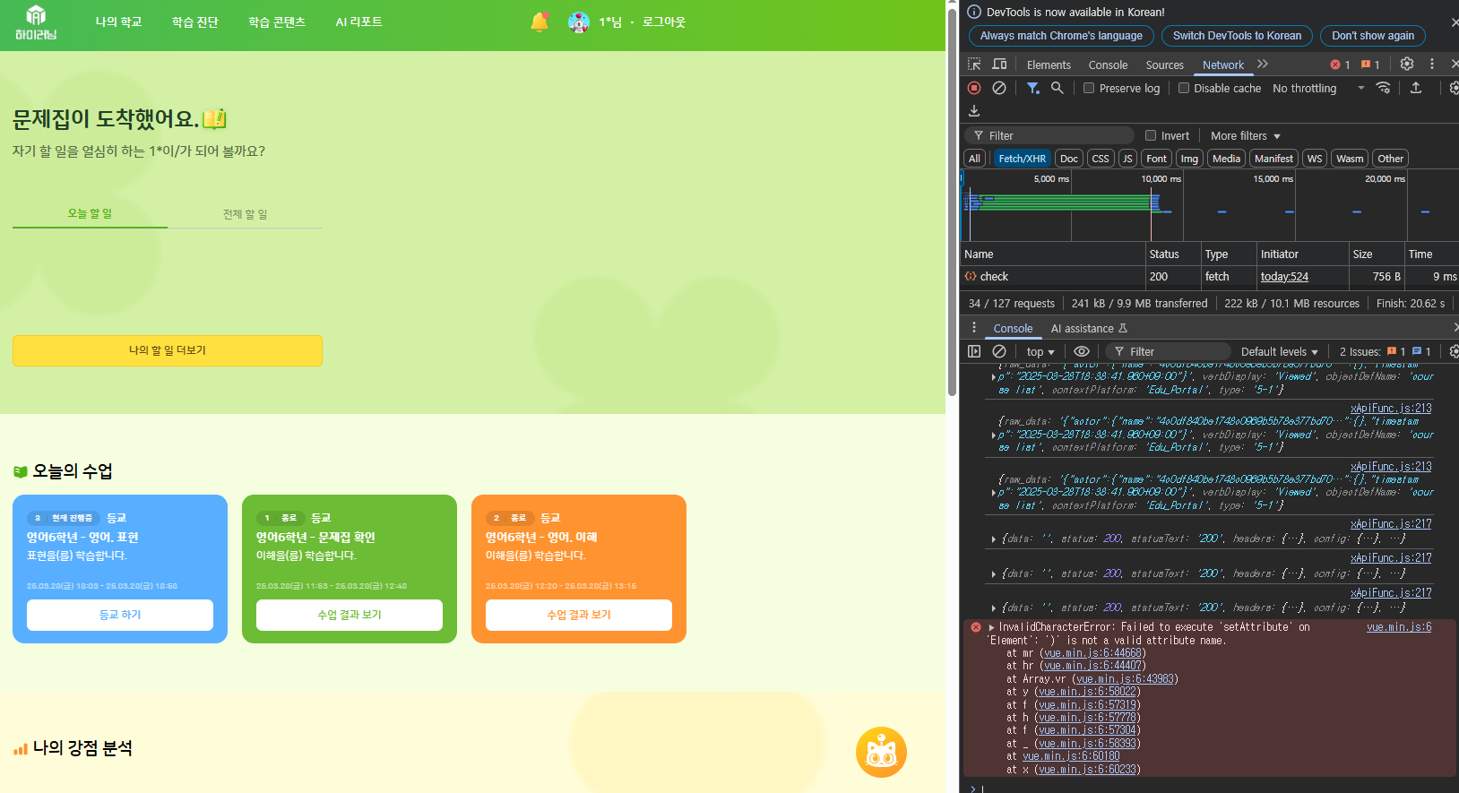 | Description | 특정 학생 로그인 시 메인 페이지 비정상 노출 1. 프로필 영역 비노출 2. 로그아웃 버튼 클릭 시 무반응 3. 수업 카드 오동작 | ||||