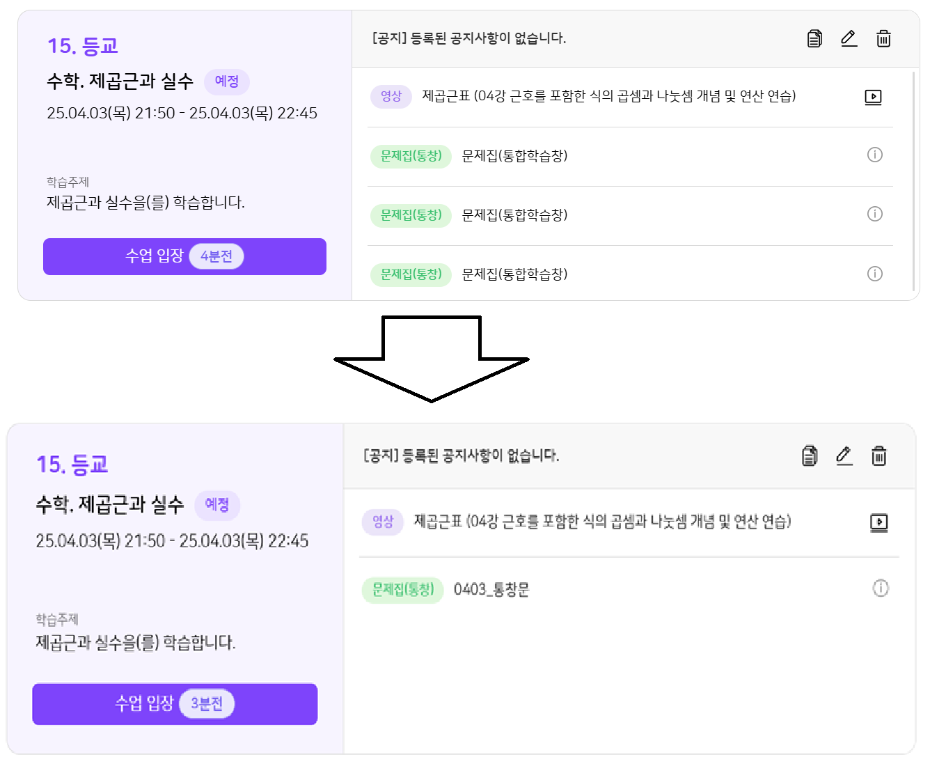 0403_21:40분 재 검증 결과입니다. FO에서 문제집(통창)을 포함해서 수업 생성 > 통창 진입 : 통창에선 문제집(통창) 노출 안됨 > 통창에서 문제풀이 추가 > 통창 종료 > FO에 문제집(통창)이 삭제됨 |