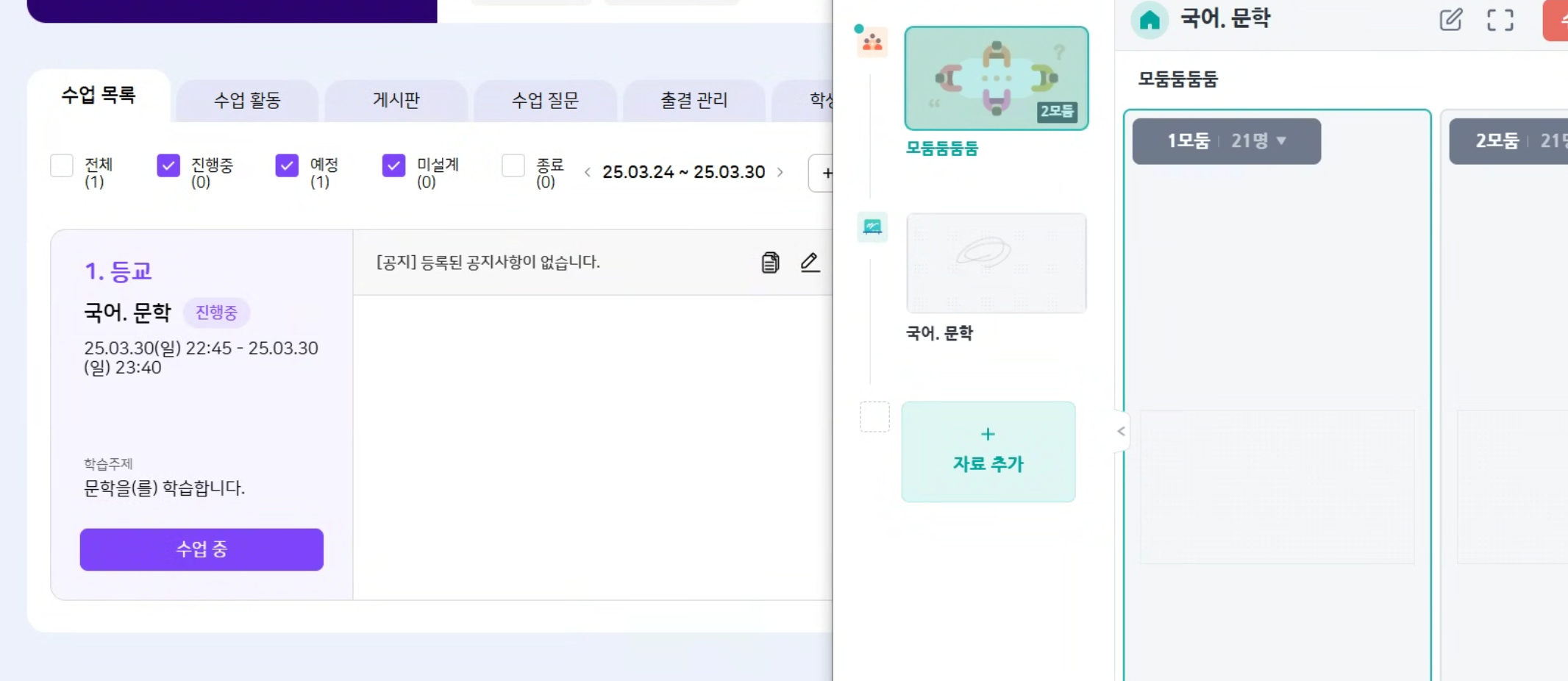 | Description | 모둠/발표 생성 후 이름 수정 기능이 정상적으로 동작하지 않는현상 1. FO 미적용 2. 통창 자료 추가 영역에서 변경되지 않음 3. 상세 내역에는 적용 | ||||