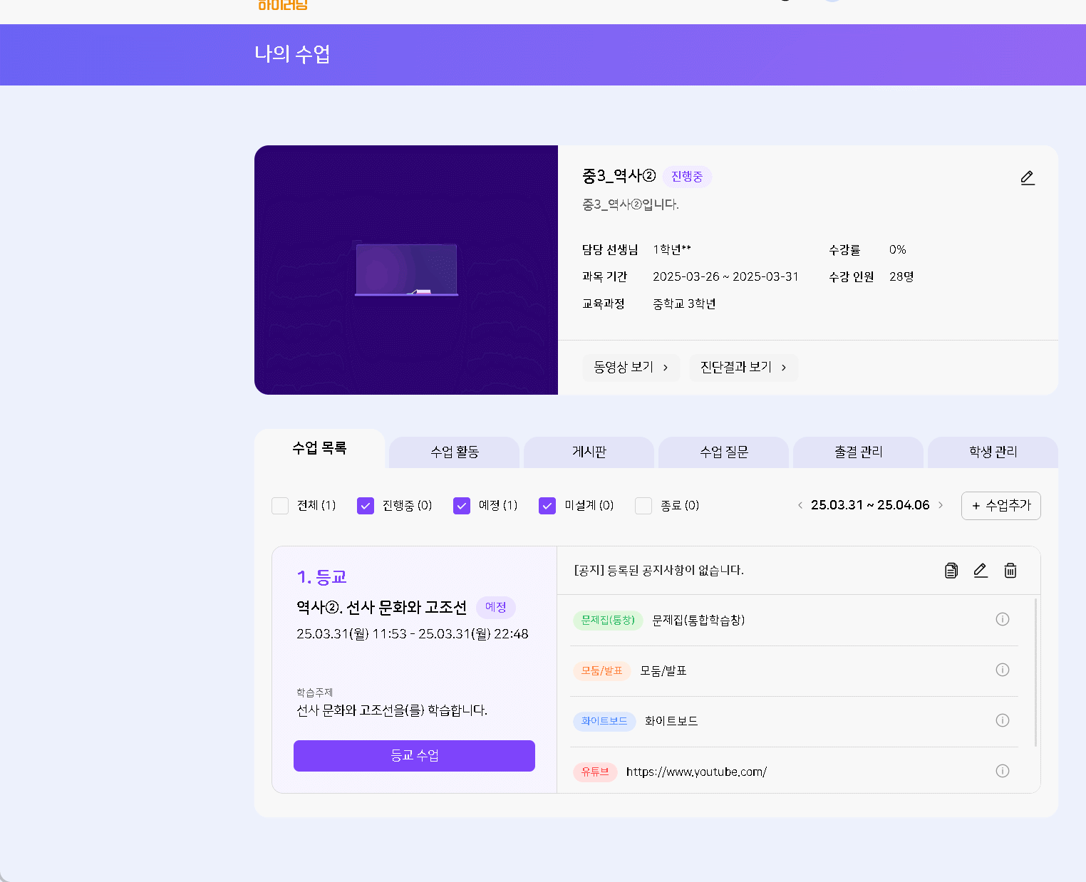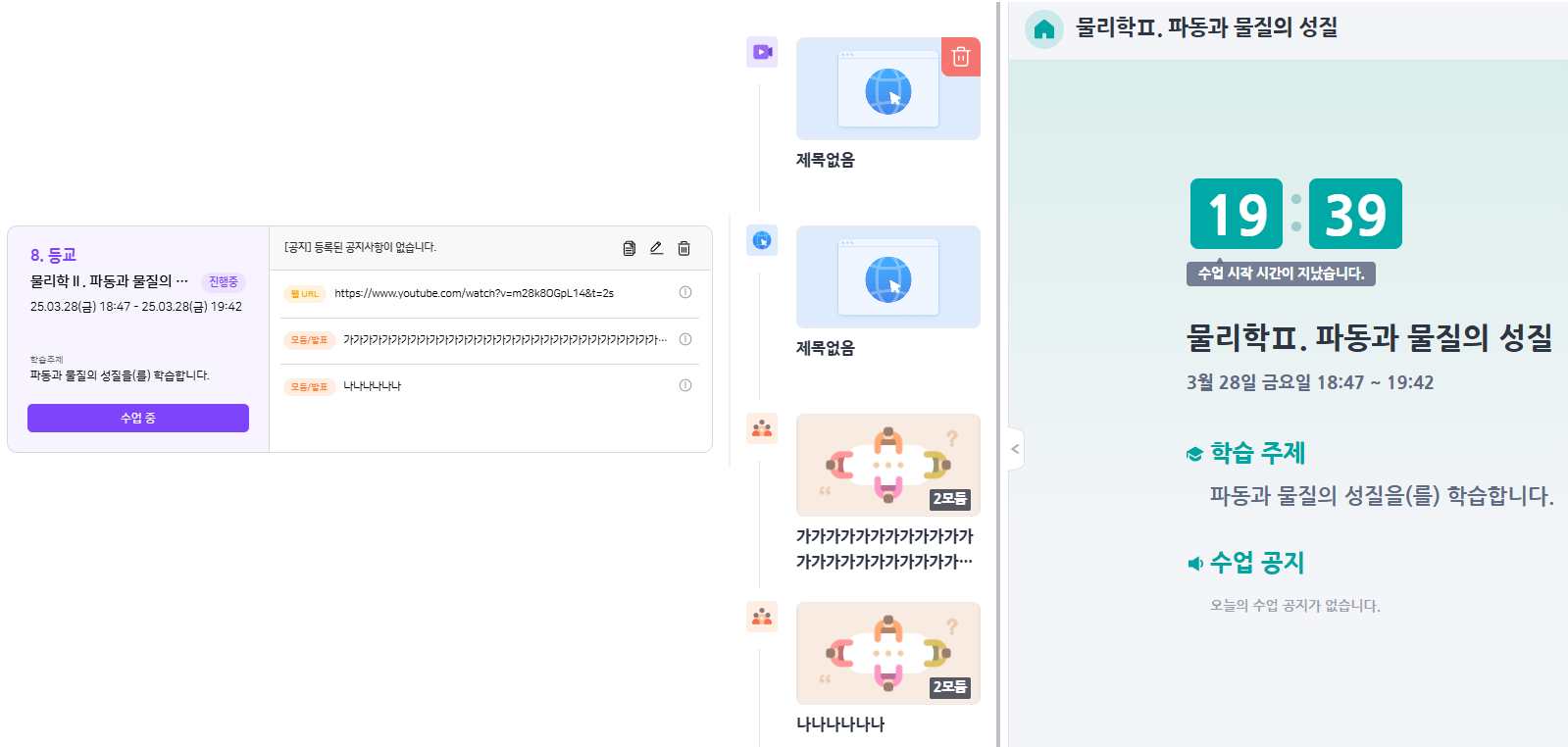 내용 추가. 수업 생성 - 유튜브 링크 추가 > 통창에서 콘텐츠 추가(교재, 모둠수업, 화이트보드, 문제풀이 등) > 수업 카드 확인시 유튜브 링크 삭제됨 |