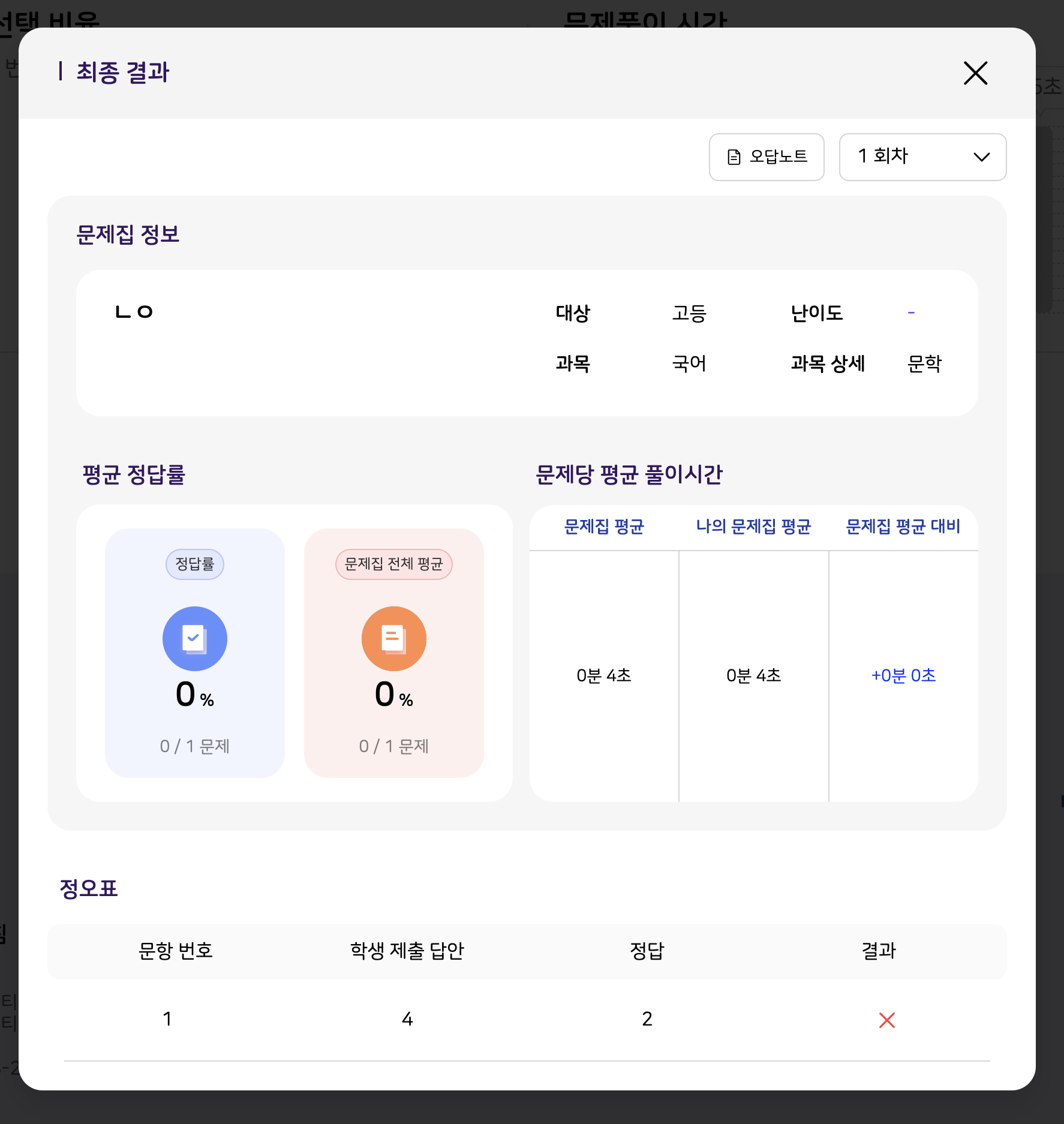 교사 : TB 수정 확인 학생 : 동일 증상 재발생하여 reopen 하겠습니다 학생 증상 1. 랜덤 : 출제 후 문제까지는 잘 풀 수 있으나, '최종 결과지 보기' 버튼 클릭 시 버튼 무반응 2. AI : 여전히 헤더와 푸터 부분만 노출되고 문제집 미노출 |