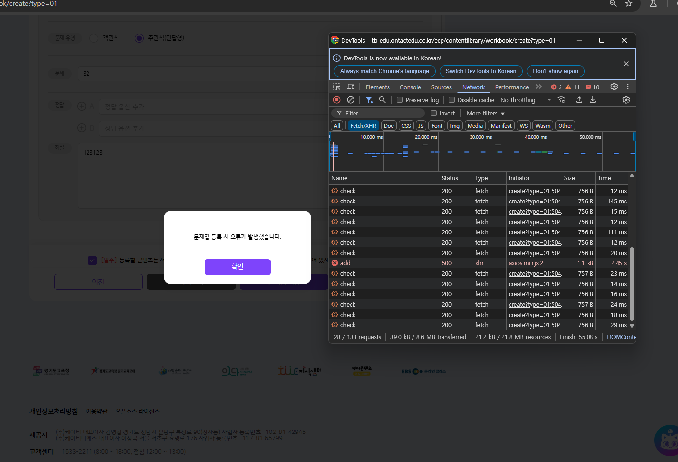 | Description | 직접 출제 이미지 첨부 용량 1MB 초과 시 오류 팝업 노출 'add 500' 상용 : 8MB 정상 등록 확인 TB : 500KB 는 등록 확인했으나 1MB 초과 시 팝업 노출 | ||||