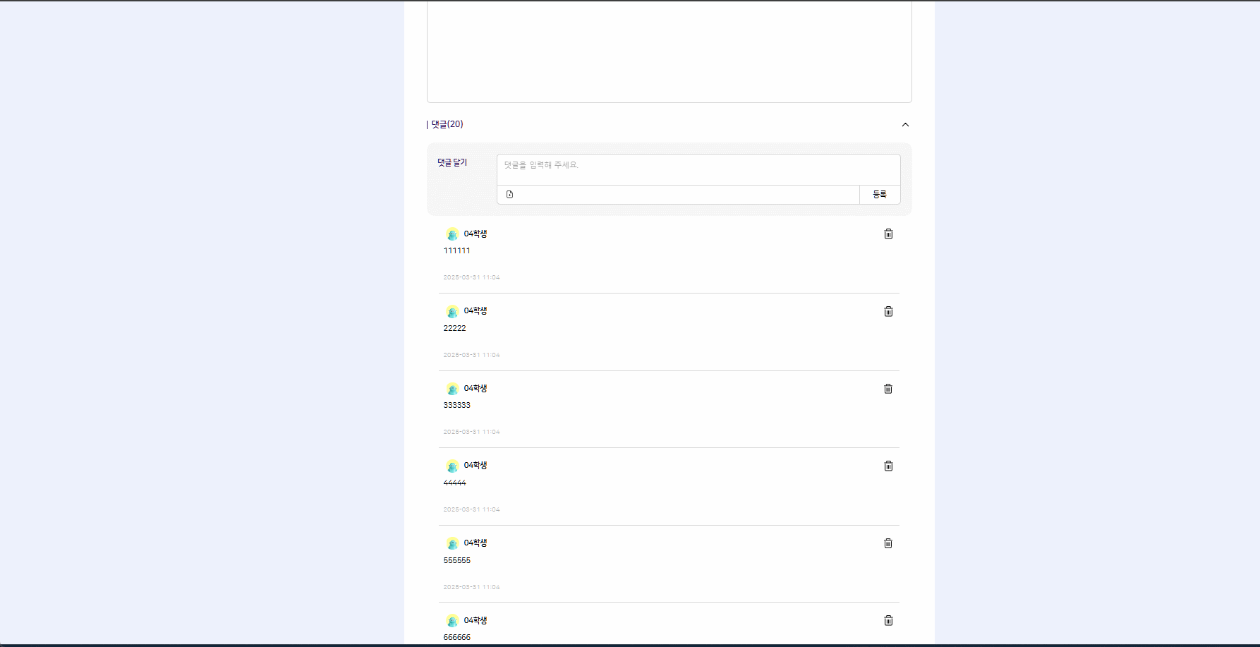 | 2025-03-31 04:21 | 김소원 | File Added: 학생 삭제 시 댓글이 정상적으로 노출되지 않는 현상.gif | |
