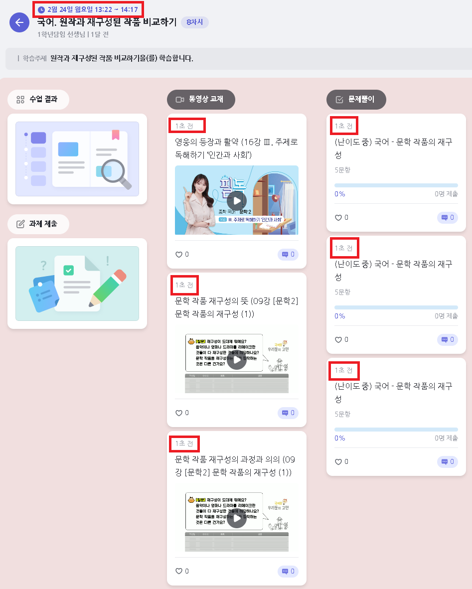 | Description | (ECP)클래스보드 - 과목 상세 - 콘텐츠 시간 카운트 오류 과목-수업 카드에는 이전에 생성 날자 찍히는데 수업 첫 진입시 컨텐츠가 0초 부터 카운트 되는 현상 발생 | ||||