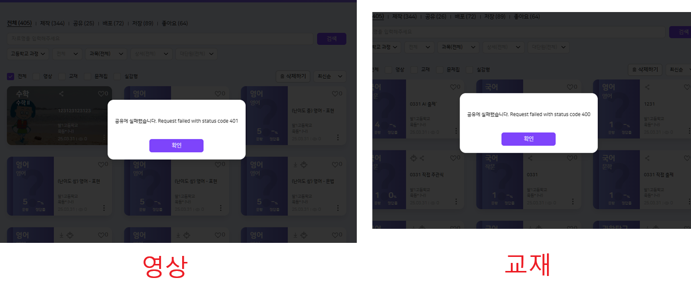 | Description | 영상 / 문항 공유 설정 변경 시 에러 팝업 노출 영상 401 문항 400 | ||||